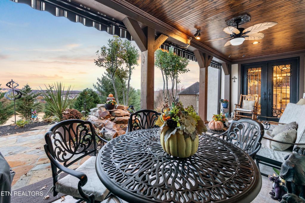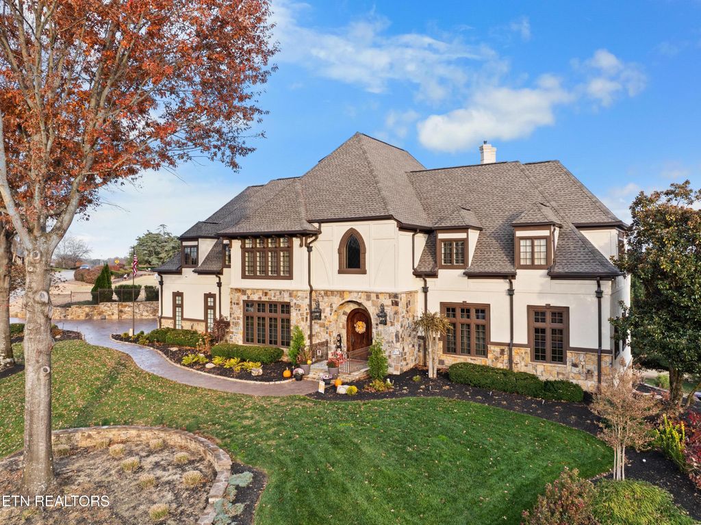 A prominent corner lot with landscape lighting, a refined motor court, sculpted landscaping, a new tranquil waterfall, and layered outdoor living spaces set a gracious tone for arrival, entertaining and soaking in the untouchable views of this gorgeous golf course that overlooks the Great Smoky Mountains in the distance.