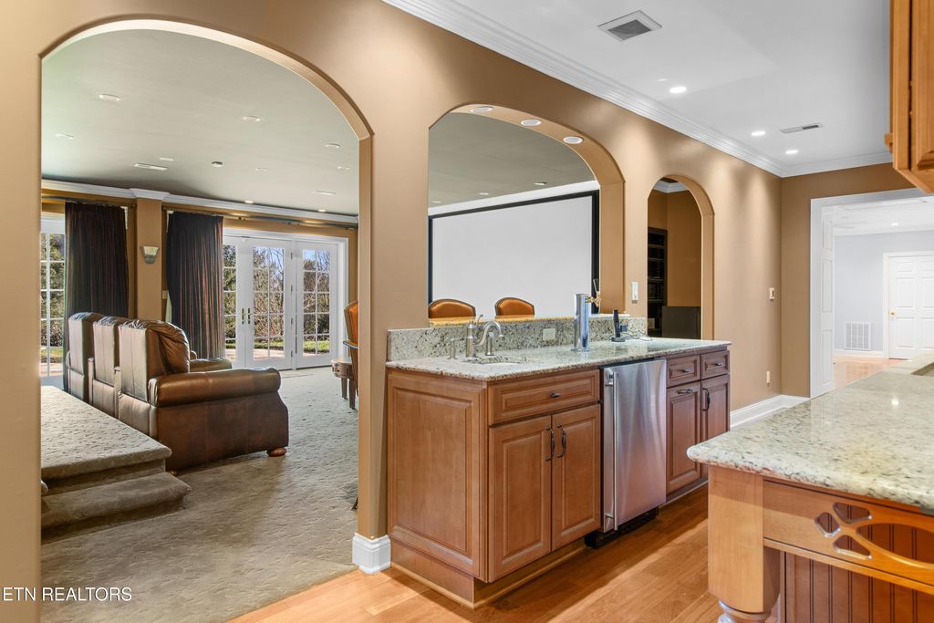 The terrace level is an entertainer's haven: a true theater with electric blackout draperies, theater seating, a new projector, a full bar with beer tap refrigerator, wine fridge, ice maker, sink, and dishwasher! There is a large exercise room with adjoining bath, a guest bedroom, and an expansive storage room with shelving! When you walk out the large French doors you arrive to the lower-level outdoor entertaining deck with a gorgeous stone patio, waterfall and enviable outlooks.