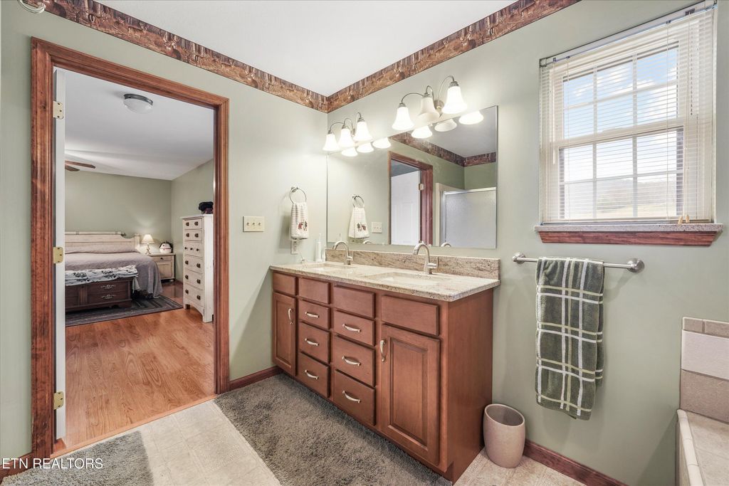 Spacious main suite with a jetted tub, walk-in shower, and dual-sink granite vanity.