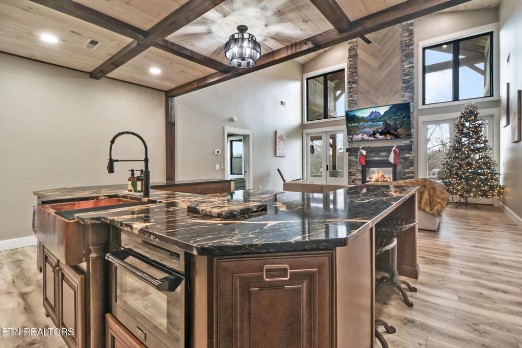 At the heart of the home, the gourmet kitchen is a chef's dream, centered around a professional-grade Z-line dual-fuel range. This high-performance appliance combines a precise gas cooktop with an electric convection oven, embodying 'Attainable Luxury®' for flawless cooking results. A built-in booth with breakfast bars on both sides gives you plenty of seating options for family and guests. The living area has floor to ceiling stone with a see-thru fireplace. You can enjoy the fire inside or sit on the covered porch and watch the flames flicker as you survey the natural beauty of the land.