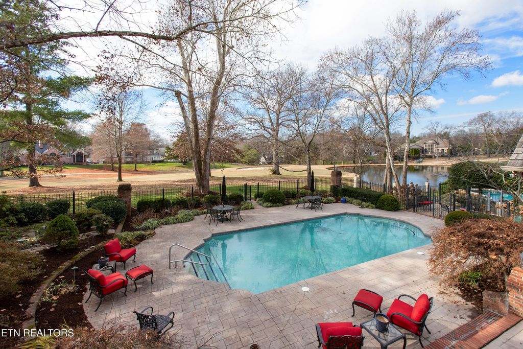 Traditional custom built all brick home with cedar shake roof. Overlooks small lake feature and from the pool the view of 12th fairway is captivating. Wrought iron fencing, bomanite courtyard, sunroom also overlooks all the back which is a parklike setting. Oversize primary suite on main level with fireplace. Lower level perfect for media, workout and more. Large great room with newly refinished hardwood floors.