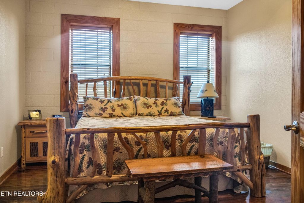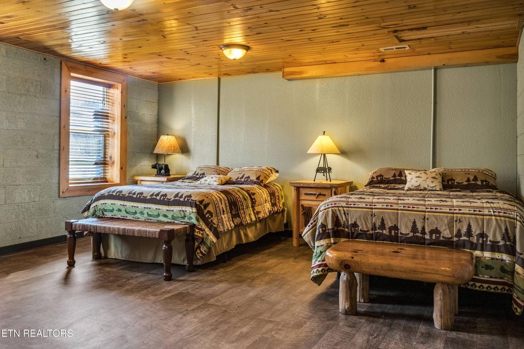 Bear's Den is a spacious mountain retreat perfectly designed for large groups, reunions, and special events, renting for $399-$449 per night. Sleeping up to 18 guests, this 6-bedroom lodge features 4 king beds, 5 queen beds, and 4½ baths, providing plenty of room for comfort and privacy. Perched on a hillside overlooking beautiful historic downtown Tellico Plains, Bear's Den offers sweeping views and a peaceful, relaxed setting while keeping you close to the heart of town and the famous Cherohala Skyway"”a favorite route for travelers, riders, and driving enthusiasts. Inside, you'll find generous gathering spaces where everyone can be together. The main living area is set up for conversation, games, and movie nights, with ample seating, a warm electric fireplace, and a large TV. The extra-large kitchen is built for groups, offering abundant counter space, multiple appliances, and room to prepare big family-style meals. Just off the kitchen, dining space accommodates large parties so your entire group can sit and eat together. The primary suite on the main floor offers an especially relaxing retreat, with direct porch access and a spacious ensuite bath featuring a walk-in shower and a soothing jacuzzi tub. Additional bedrooms are thoughtfully arranged to comfortably host multiple families, couples, or friends traveling together, with plenty of beds and bathrooms to make mornings and evenings easy. Downstairs, the game room keeps everyone entertained, featuring a pool table, TV, and additional space for cards, board games, and kids to hang out. Step outside to enjoy the expansive yard and outdoor areas. The large grassy lawn is ideal for yard games, picnics, and casual gatherings, and it also works wonderfully for weddings, family reunions, business retreats, and other events. Ample parking makes group logistics simple, whether guests arrive in multiple vehicles, motorcycles, or small trailers. With its combination of size, comfort, and location, Bear's Den is equally suited to a weekend getaway, a multi-family vacation, or a destination celebration. Enjoy stunning views over Tellico Plains, quick access to dining and local shops, and an easy drive to the scenic Cherohala Skyway, waterfalls, hiking, fishing, and outdoor adventures in the surrounding mountains. Bear's Den offers the space, amenities, and setting you need to bring everyone together and make lasting memories in East Tennessee.
