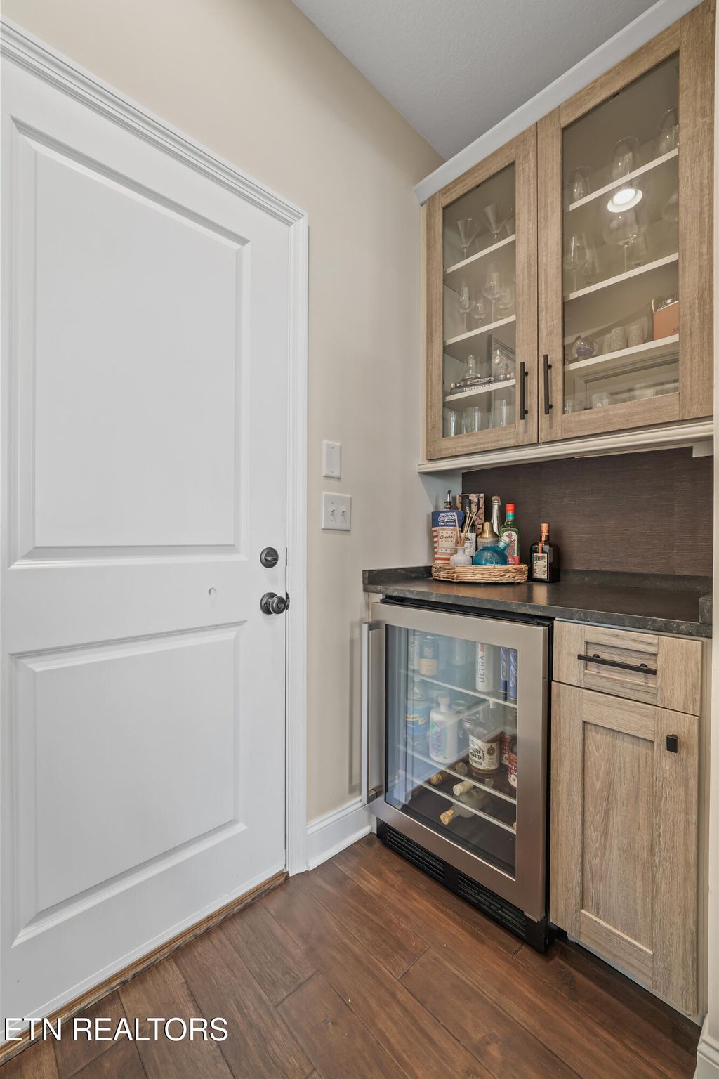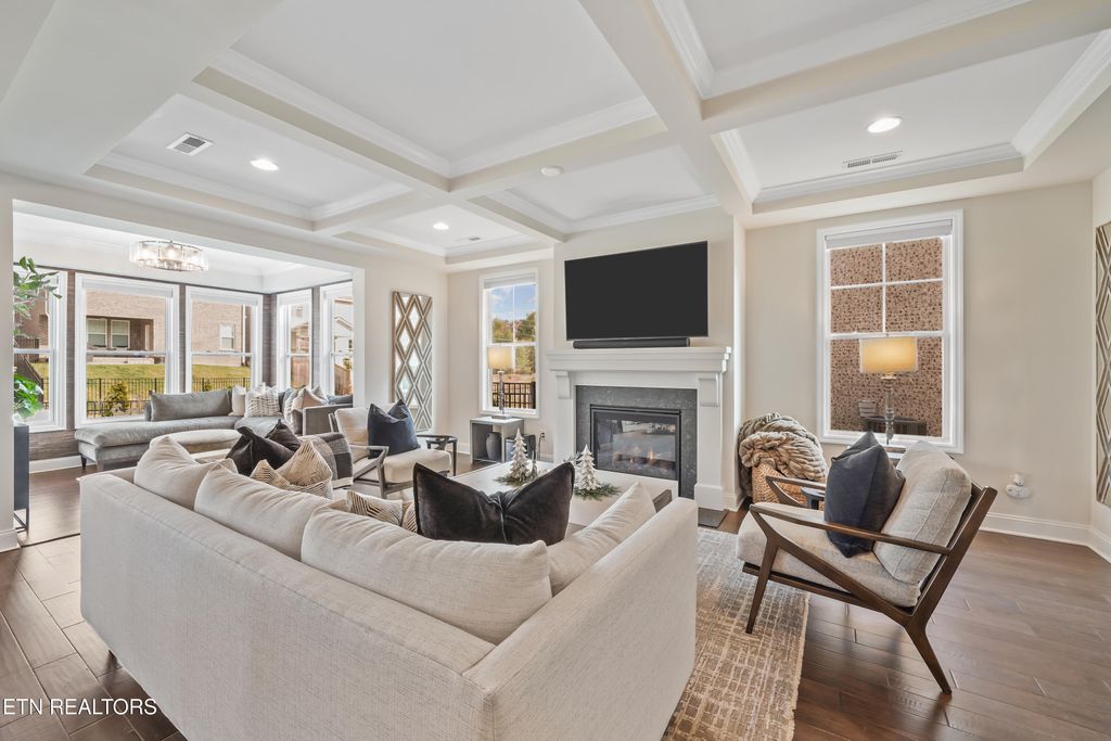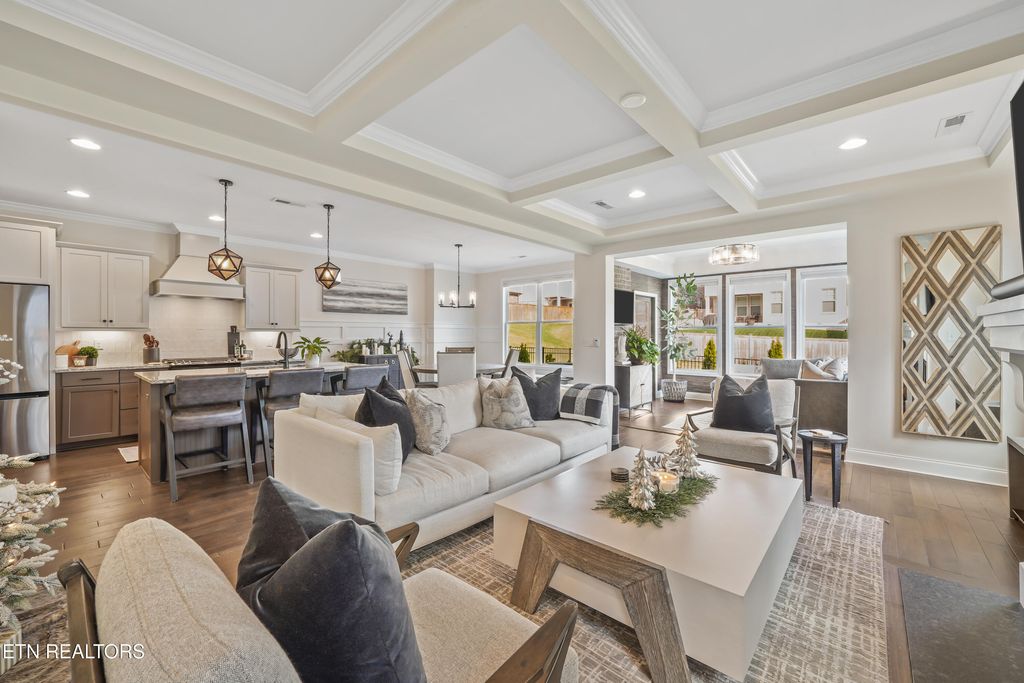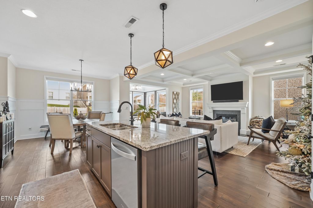 Featuring 3 bedrooms and 2.5 baths, the main level boasts an open-concept kitchen and living area, complete with a dry bar, two pantries, and a charming sunroom accented with elegant grasscloth wallpaper. The coffered ceilings add an extra touch of sophistication to the space.
