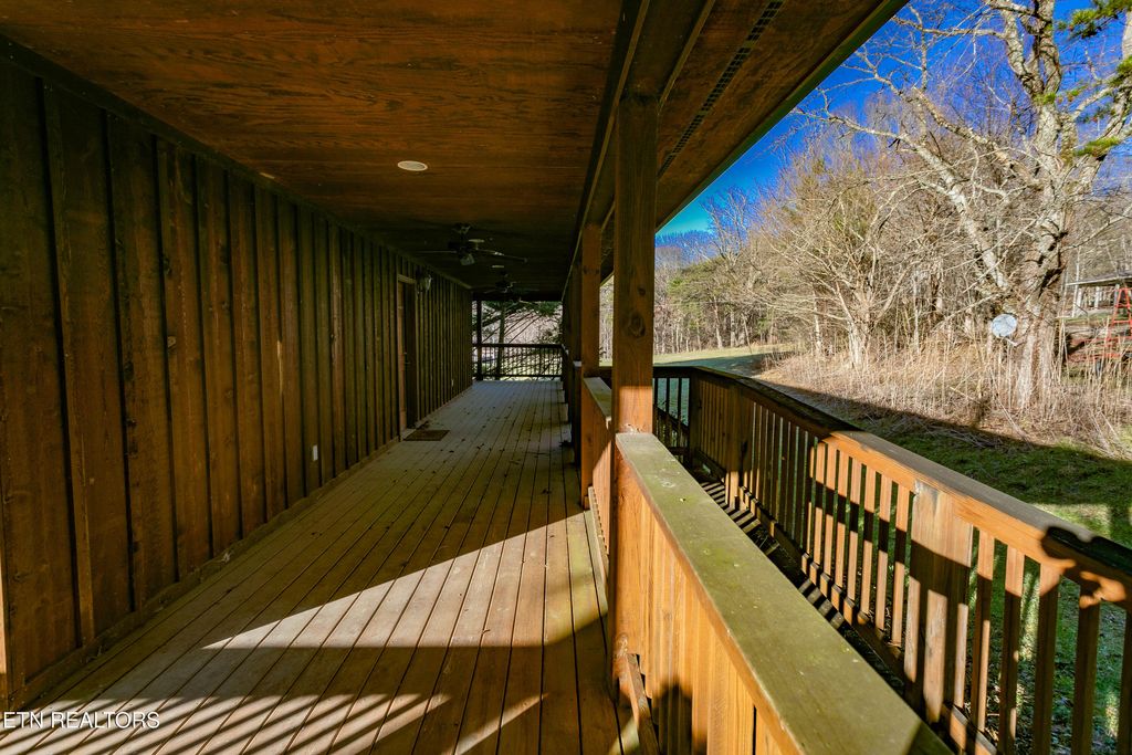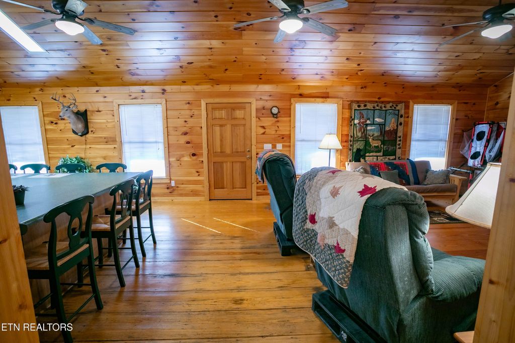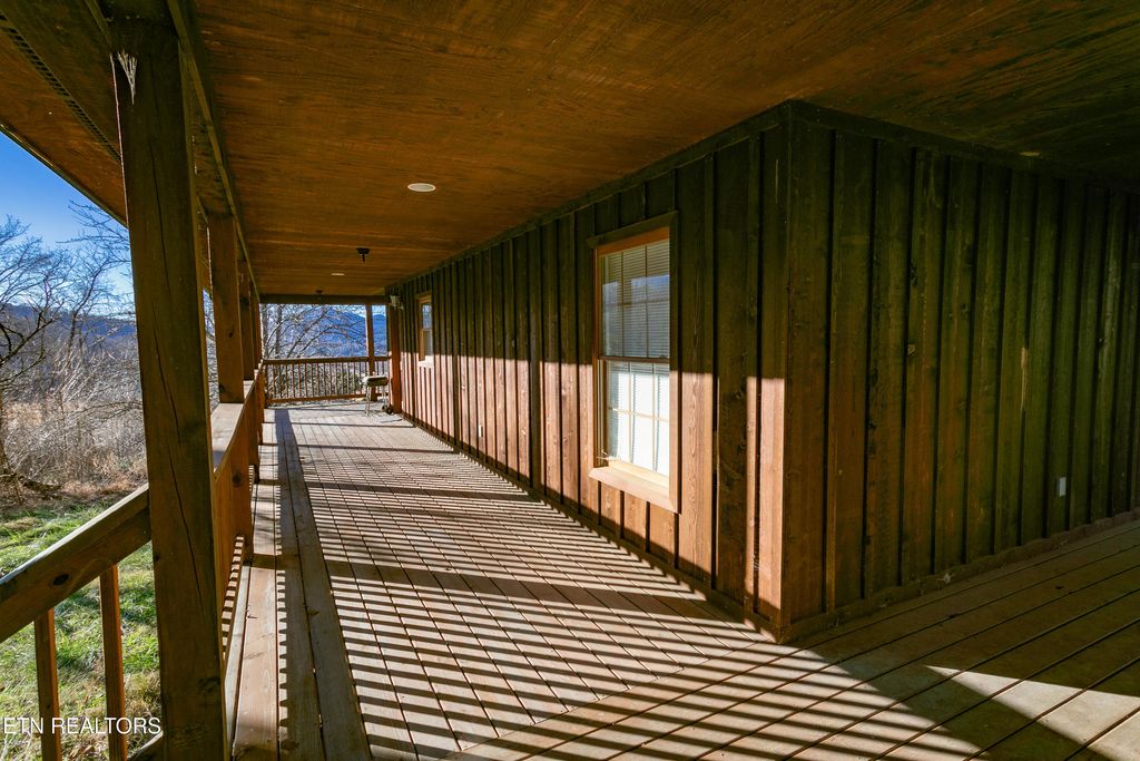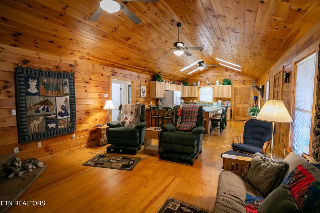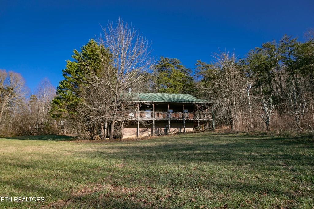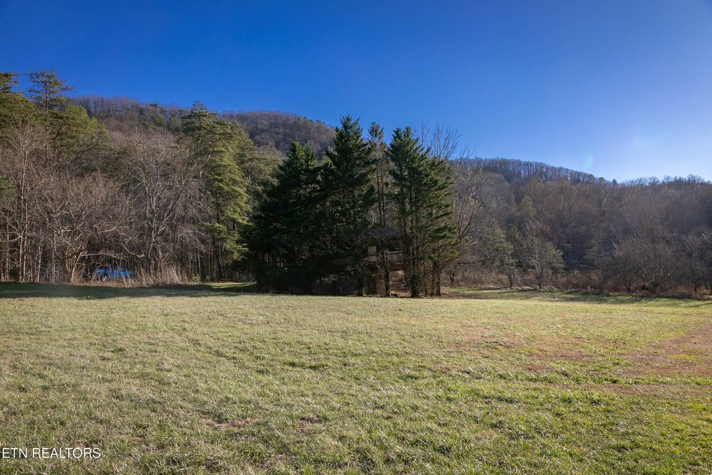 This 2-bedroom, 2-bath home spans 1216 sq ft and is located in the heart of Wears Valley on 2.3 acres of level land at the base of the Smoky Mountains. It features a rustic style, with wraparound porches on all sides, a warm interior highlighted by large pine plank floors, and a stacked stone fireplace. The open-concept design connects the living room and spacious kitchen, which includes an extra-large bar creating a lodge-like feel. The house has two large tiled bathrooms. It is just minutes from the Great Smoky Mountain National Park entrance and close to local attractions, amenities, and entertainment.