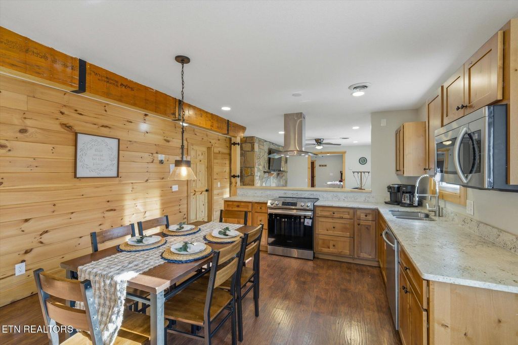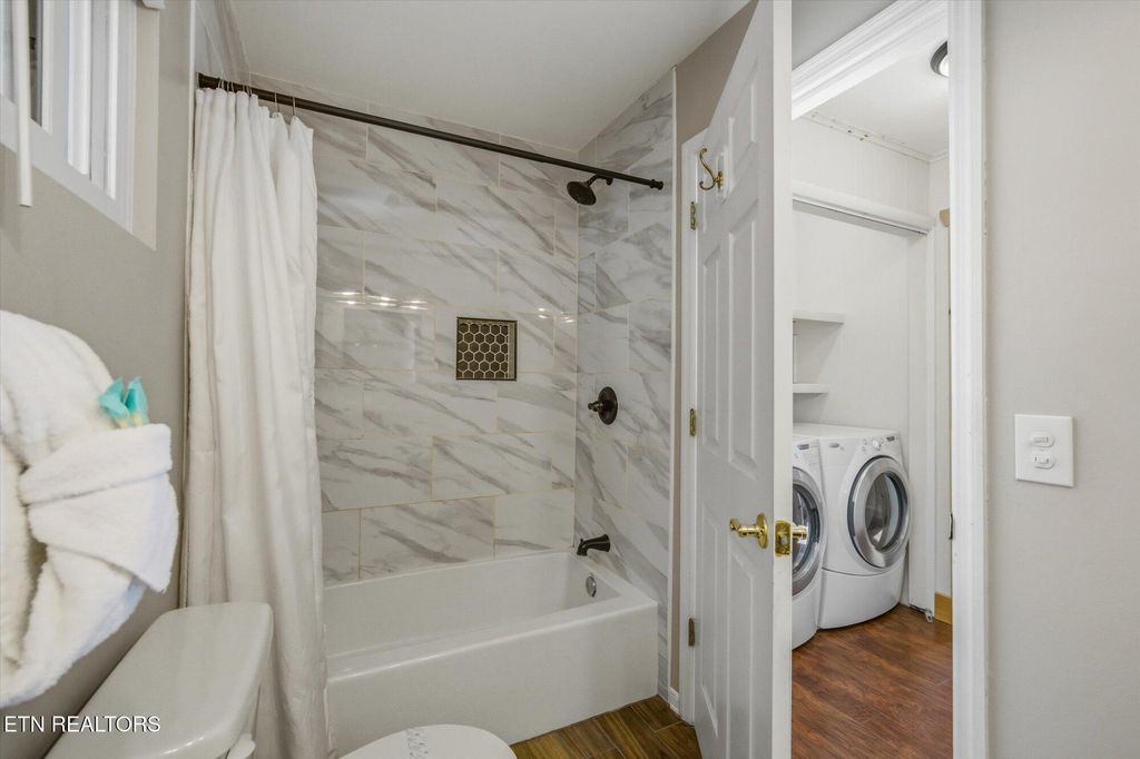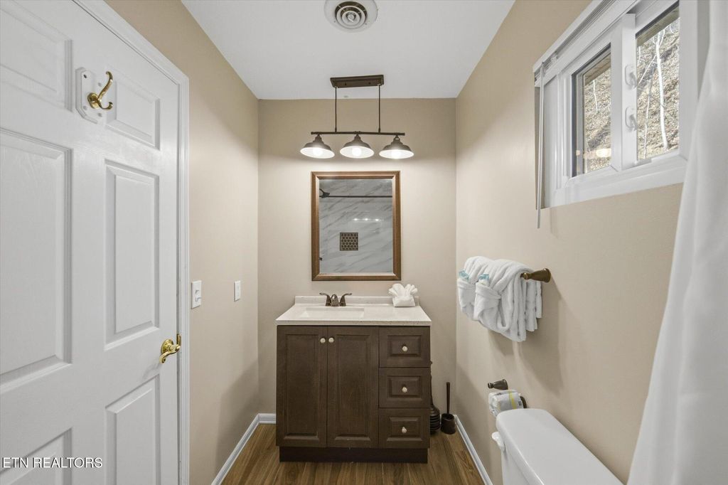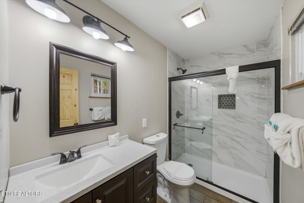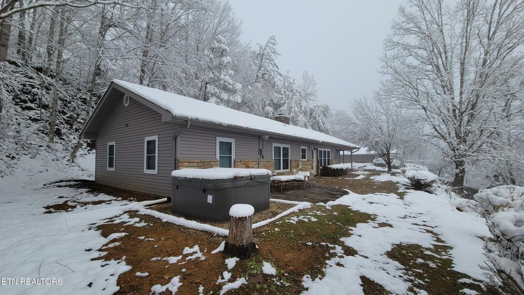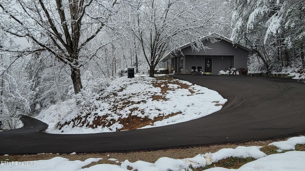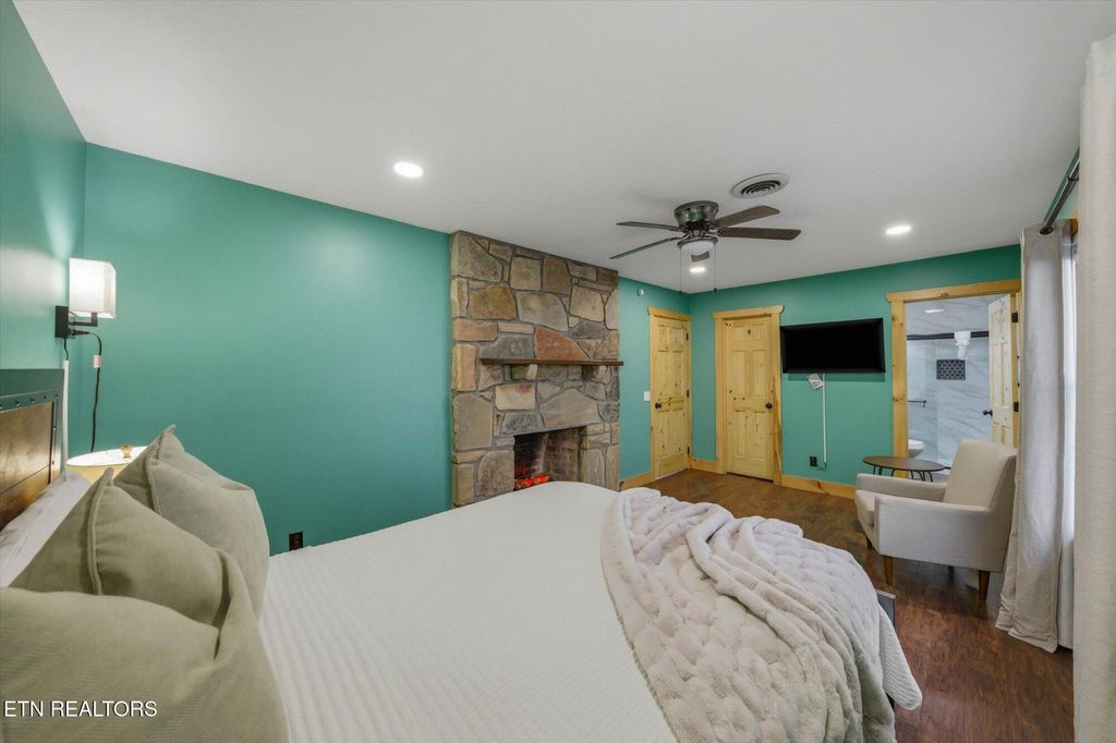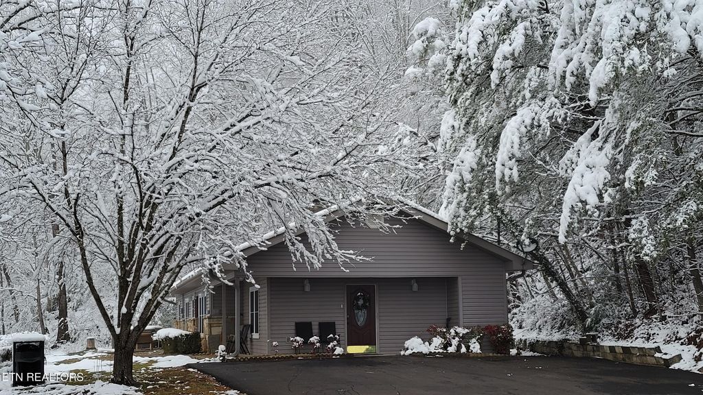 ONE-LEVEL 3BR/2BA chalet with VIEWS of MTN LECONTE located just less than 1mi from Gatlinburg's Arts & Crafts area, only 10 minutes to Great Smoky Mountains National Park and less than 2 miles from the Gatlinburg Community Center. This no-step entry home is currently used as a second home /short-term rental and is being sold fully turnkey. The home features a spacious game room/family room that flows seamlessly into the open living area, highlighted by an impressive stone fireplace and a brand-new kitchen. The kitchen offers new cabinetry, granite countertops, stainless steel appliances, and a striking stainless vent hood, creating an inviting space for gathering and entertaining. Off the open living and kitchen area, you'll find 2 KING SIZE BEDROOMS and a 3RD BEDROOM with two sets of bunk beds. The oversized primary suite features its own stone fireplace, a large walk-in closet, and a private en-suite bathroom. All bedrooms include good size closets, and a washer/dryer closet is conveniently located near the second bathroom. Home has been fully renovated: * NEW ROOF and radon system 12.2020, *NEW HVAC and vinyl siding replaced by previous owner, in 2021: * Kitchen modified to an open‑plan layout with new premium KraftMaid soft‑close cabinets, custom leathered granite countertops, new stainless steel appliances and light/plumbing fixtures, * totally remodeled bathrooms with tile showers, ceramic floors, new cabinets and fixtures, all interior walls upgraded from bead board to drywall/wood shiplap, * Ceilings upgraded from popcorn texture to modern orange‑peel finish, * flooring throughout updated with water‑ and scratch‑resistant engineered wood flooring, * all new light fixtures, * all new plumbing fixtures, upgraded to PEX piping with new bathroom and kitchen connections, * New interior wooden doors, decorative wooden beams and accent walls, *Entire driveway and parking area upgraded from gravel to asphalt, * New hot tub, etc. A move-in-ready mountain retreat ideal for full-time living, a second home, or continued STR use.
