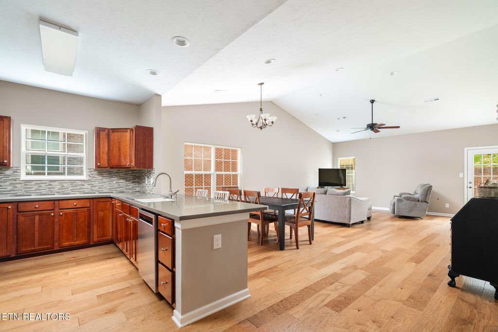 The home opens into an inviting open-concept living area designed for both comfort and entertaining. The kitchen is equipped with stainless steel appliances and features a large peninsula offering additional prep space and seating. The adjoining living and dining area boasts soaring cathedral ceilings and provides plenty of room for both dining and relaxation.