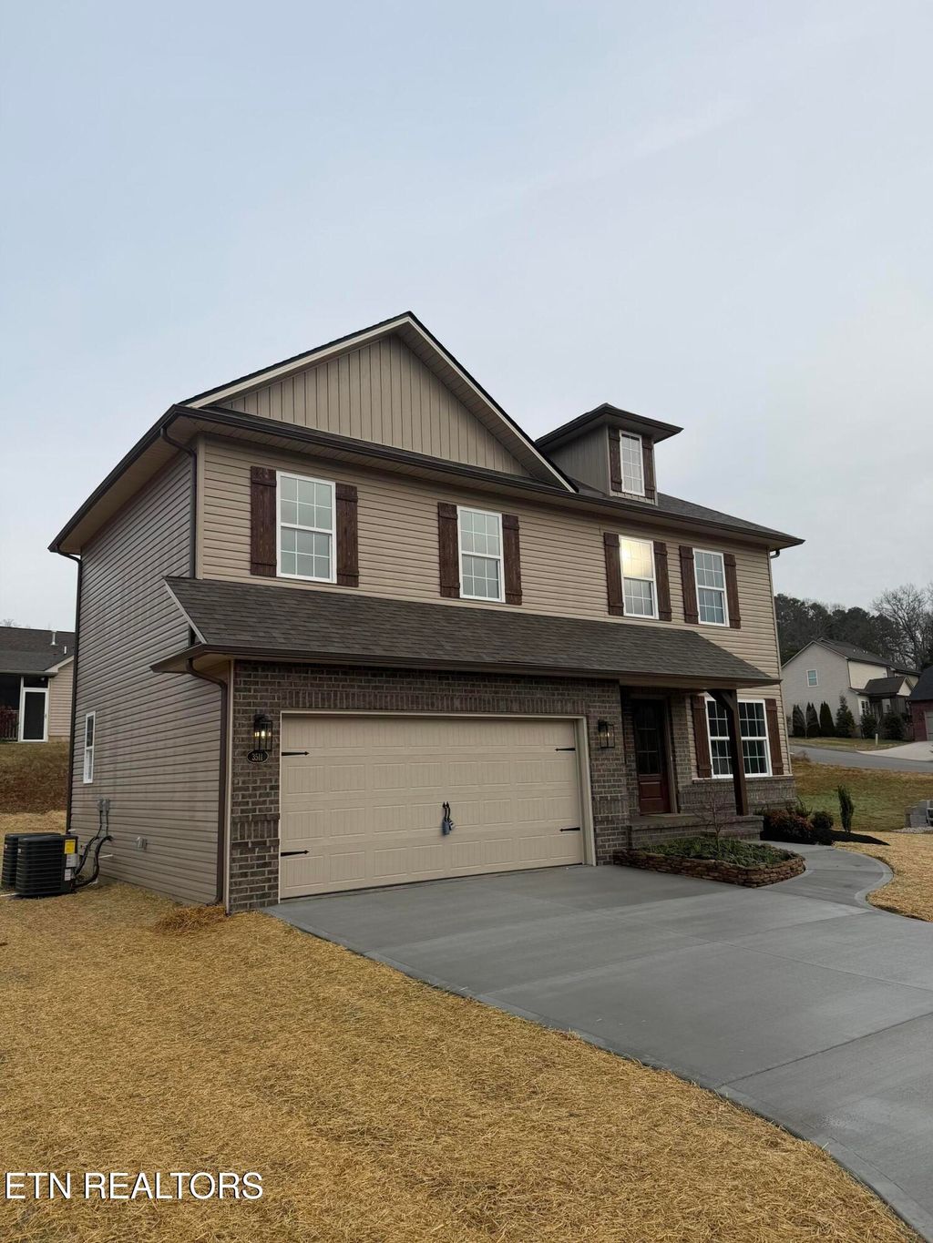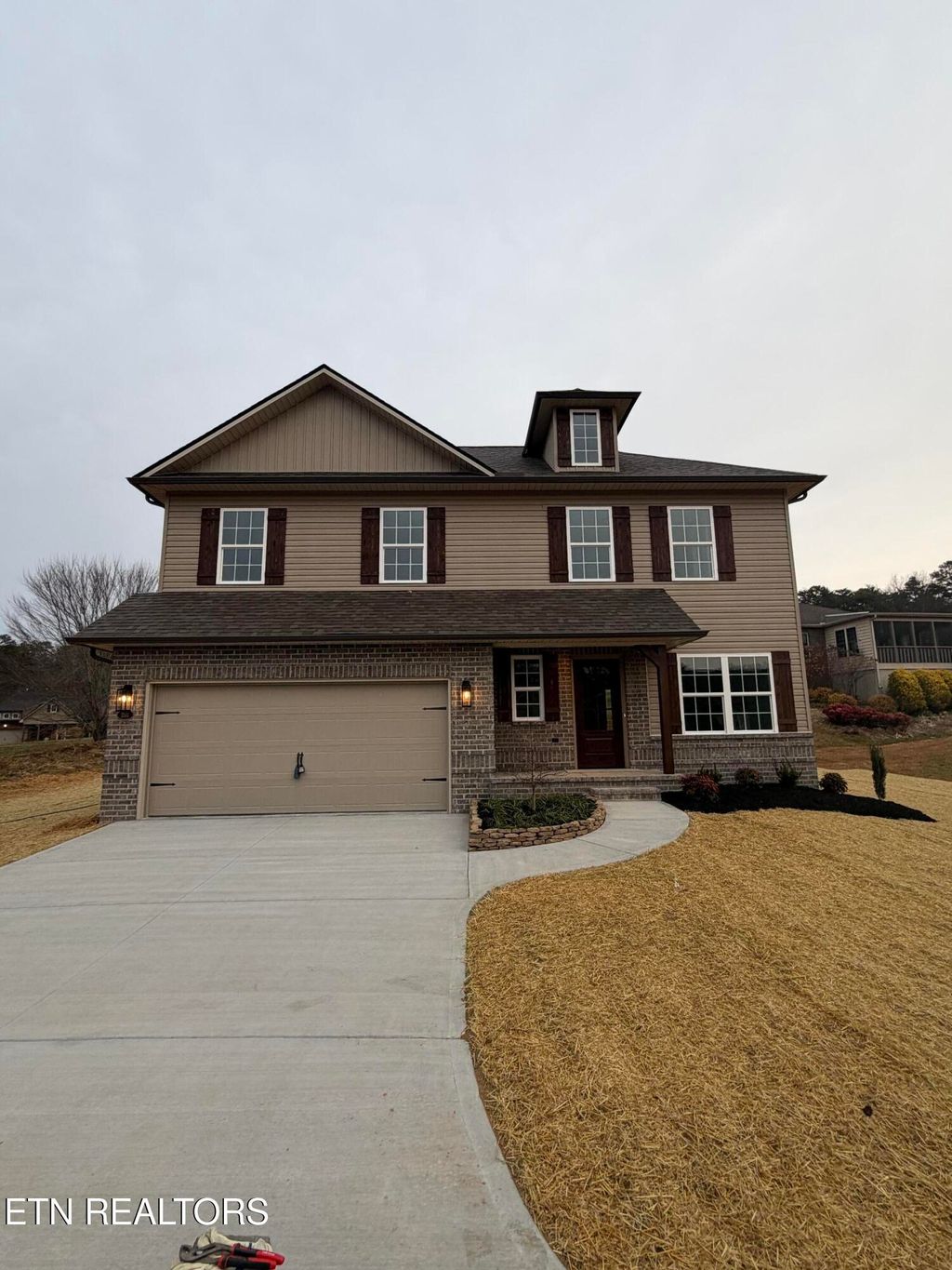 This newly constructed three-bedroom, 2.5-bath home is situated in a beautiful neighborhood conveniently located near downtown Knoxville. The two-story layout features an accent wall in both the master bedroom and living room, enhancing the home's modern appeal. The main floor boasts luxury vinyl (LV) flooring throughout the living areas, while cozy carpeting is found in the master and additional bedrooms. Enjoy outdoor living with a deck accessible from the dining area, perfect for entertaining or relaxing. The kitchen includes a breakfast bar counter and pantry for added convenience. A utility room and a two-car garage provide ample storage space on this level lot. 5 panel doors and bullnose corners throughout. Information deemed reliable buyer to verify.