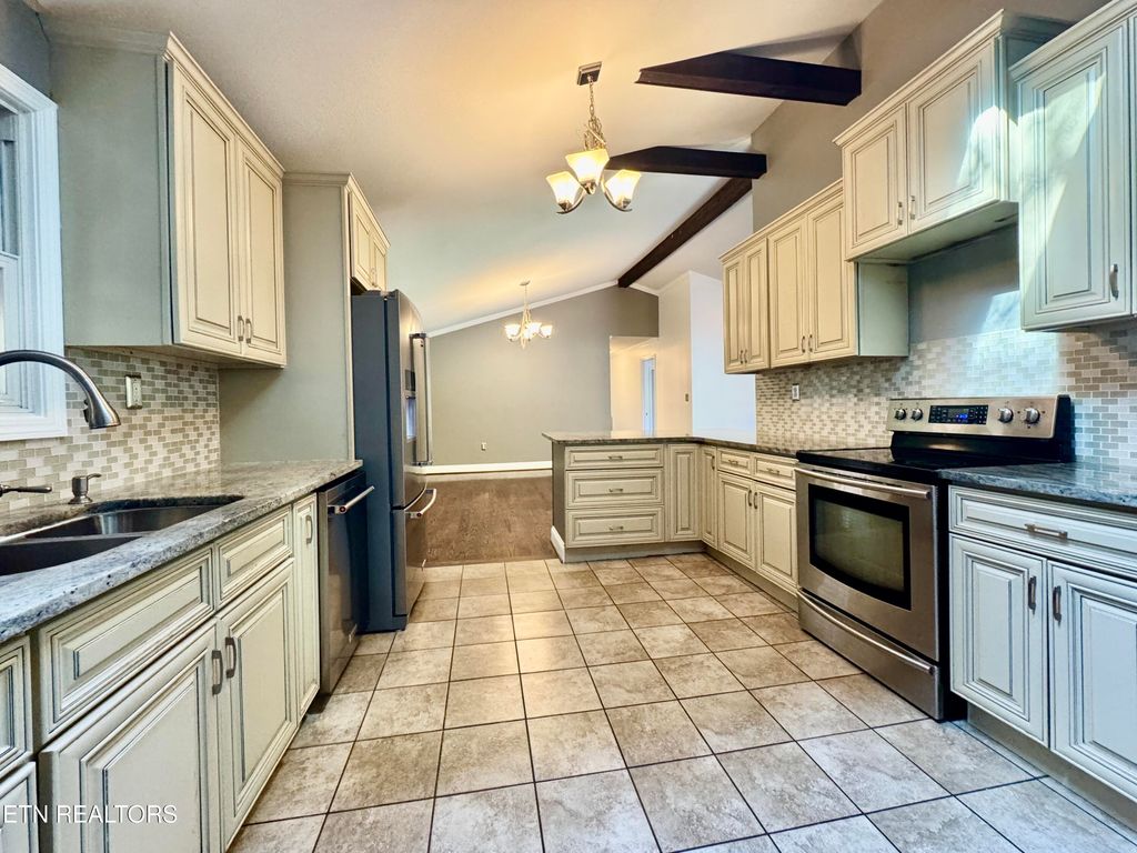 Beautiful solid hardwood flooring throughout! Gorgeous vaulted ceilings with exposed beams in the living room, kitchen, and dining area. Gourmet kitchen with granite counters, tile flooring, and stainless steel appliances. Large picture window brightening the living room. Spacious laundry room.