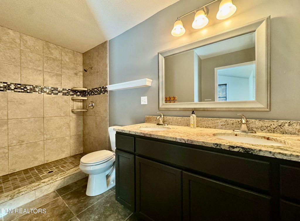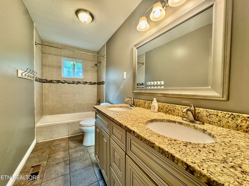 Two generous guest bedrooms on main level and guest bathroom with double sink granite top vanity, tile tub surround, and tile flooring.