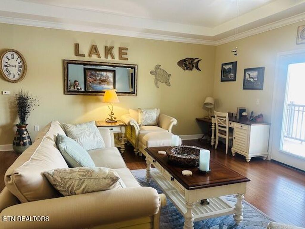 Enjoy a resort feel as you view Cherokee Lake from your living room or main bedroom. This well kept 2 bedroom unit with living room, kitchen, and two full baths is located on the 3rd floor. Elevators are on site if you prefer or steps are also an option. A well desired bonus of this unit is the garage located on the lower level for all your vehicle and storage needs. Step inside this beautifully designed residence where contemporary elegance meets cozy comfort. The home has a spacious great room adorned with a corner fireplace. Perfect for gathering with friends or unwinding after a long day. Natural light floods through the large windows, creating an inviting atmosphere. The kitchen offers granite counter tops and ample counter space for meal preparation. Whether you are hosting gatherings or enjoying a quiet breakfast with lake views, this unit is impressive. For boating enthusiasts - a marina is located across the street- separate fees apply for use. This unit is being sold fully furnished. More information can be found at www.germancreekbluffs.com.