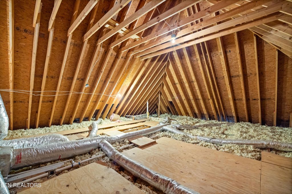 Upstairs includes four bedrooms, highlighted by a generous primary suite with walk-in closet and spa-like bath featuring double vanity, soaking tub, water closet, and floor-to-ceiling tiled walk-in shower. Three additional bedrooms share a full bath. Oversized walk-up attic provides excellent storage or future expansion potential.