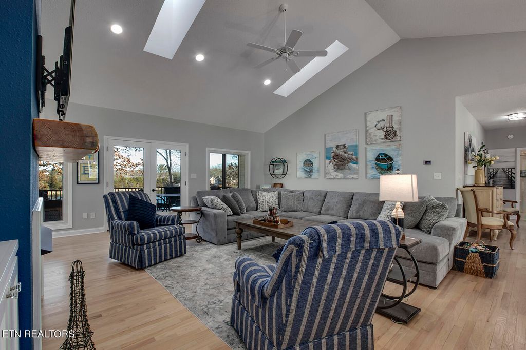 spectacular views of the lake from the great room with vaulted ceilings, ventless gas fireplace,