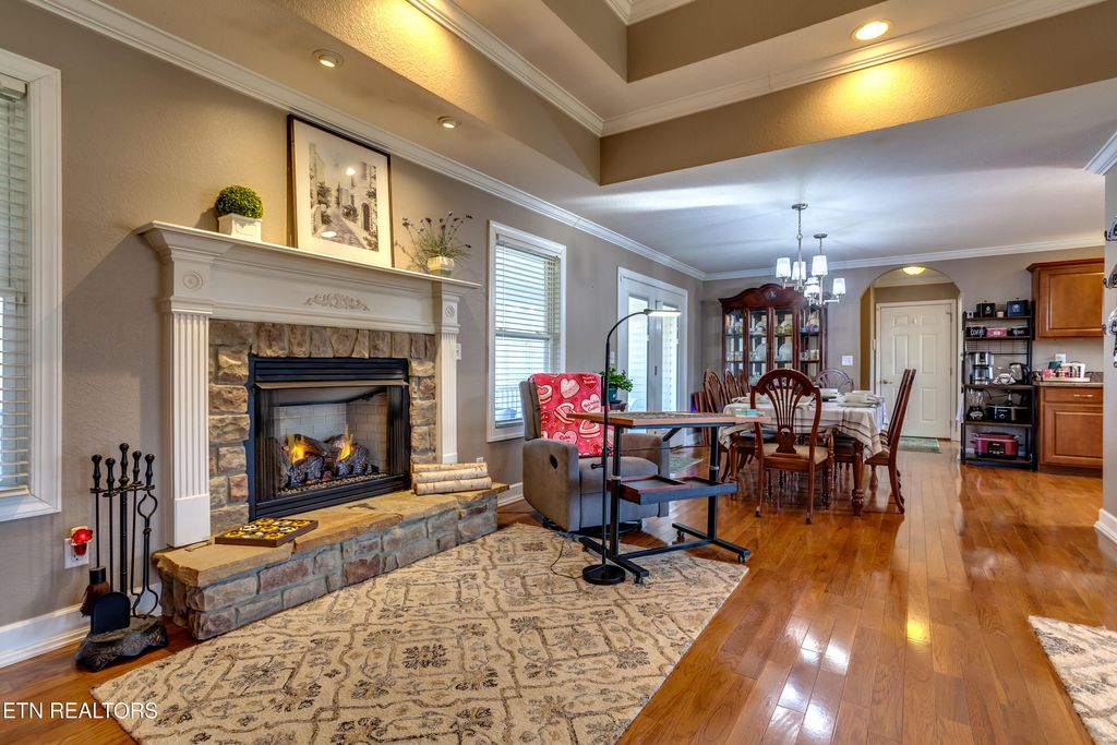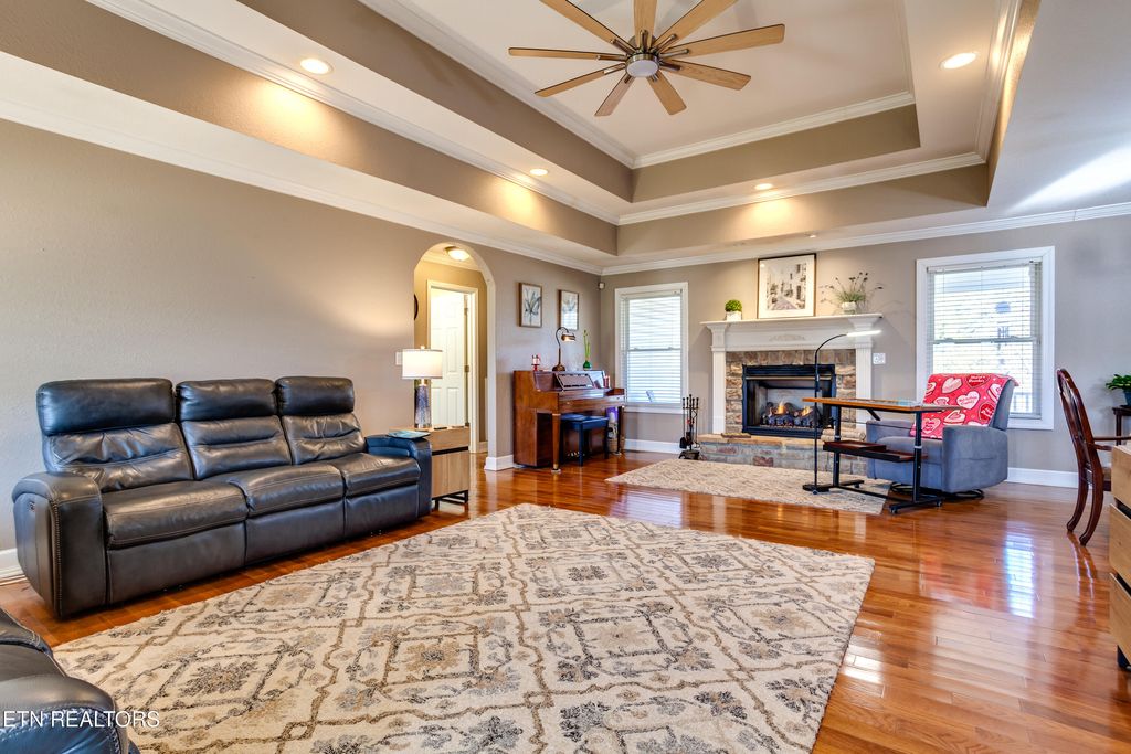 Inside, you'll love the warmth of hardwood floors, vaulted and tray ceilings, and elegant arched doorways that create both character and openness. The inviting living room features a gas log fireplace with remote, perfect for cozy evenings, and flows seamlessly into the dining area and well-designed kitchen, ideal for everyday living and entertaining.
