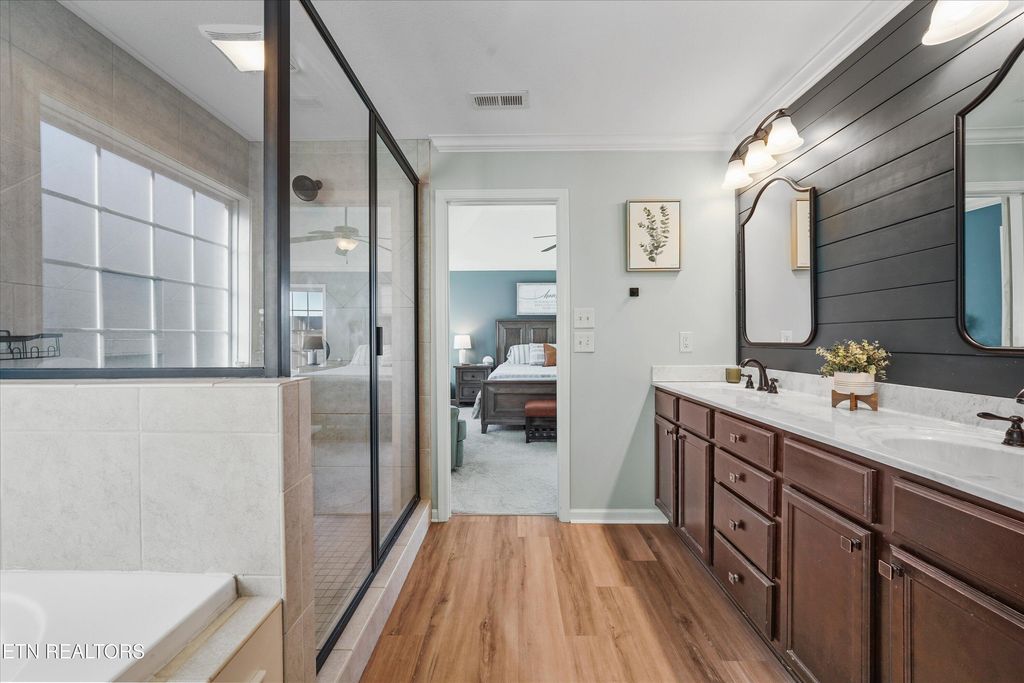 This beautifully designed brick home blends timeless charm with modern comfort, offering an inviting front porch, warm hardwood floors, and an open, layout perfect for everyday living and entertaining. The spacious kitchen features granite countertops, stainless steel appliances, a large island, and tons ofcabinetry, flowing seamlessly into the dining and living areas anchored by a cozy fireplace. The primary suite includes a spa like bath with dual vanities, a soaking tub, and a shower. Step outside to a covered back patio with a built in grilling area, and plenty of space to relax or host gatherings, all overlooking a fully fenced backyard with room to play or unwind. Thoughtful finishes, generous space, and indoor outdoor living make this home both functional and welcoming.