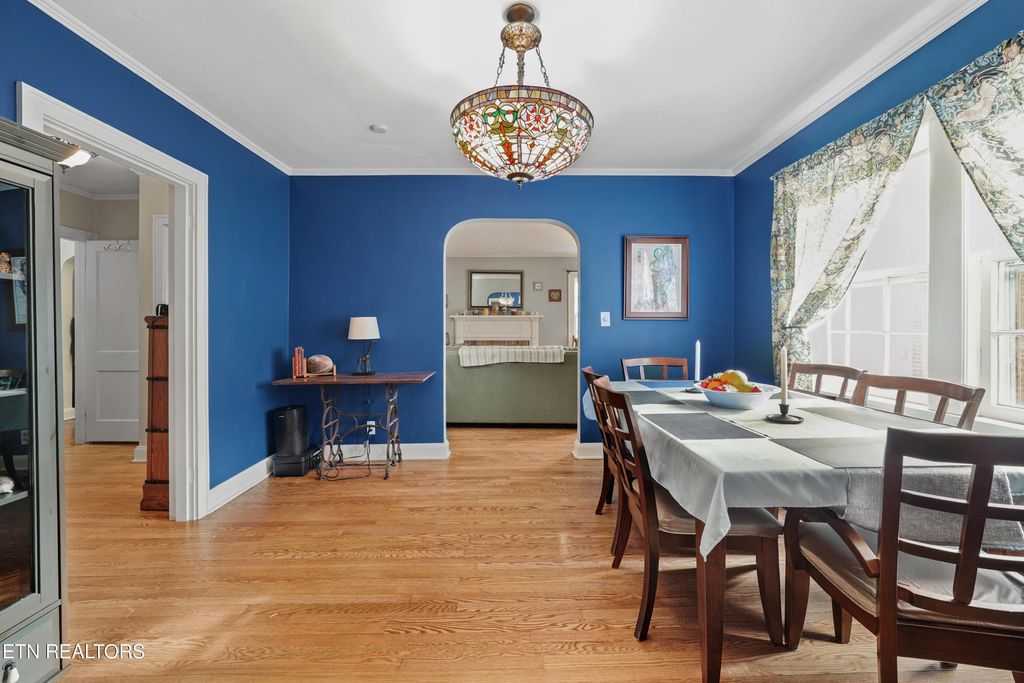Refinished hardwood floors add warmth throughout the home paired with graceful archways and timeless crown molding. Original solid wood doors with period glass doorknobs. New galvanized steel roof in 2024. Extra storage in the unfinished basement and a floored attic. Plenty of closets.