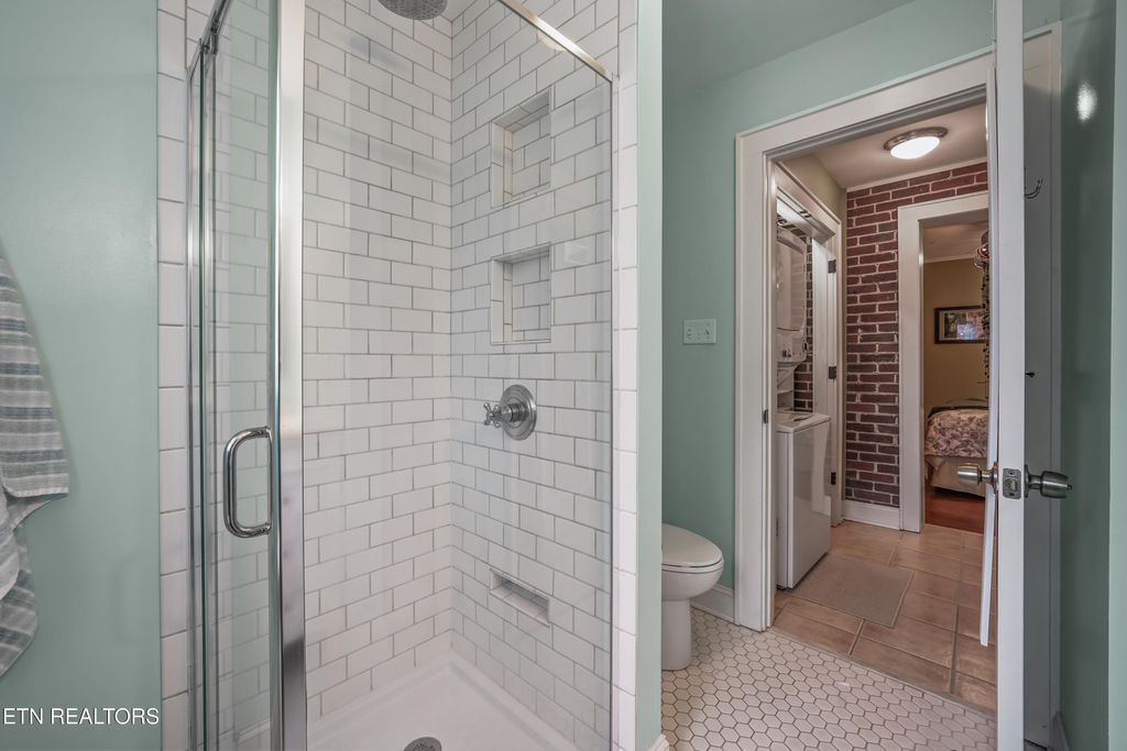 The primary suite features a walk-in shower with a rain shower head, built-in storage, hexagon tiled floors, two closets, and a convenient laundry area. Stackable washer/dryer. (2025) A hallway connects to the 2nd bedroom and includes a dressing area with closet. The full bath features an original cast iron tub, basket weave tiled floor and subway tile, linen closet, and an Art-Nouveau inspired decor. A 2008 addition provides a versatile third bedroom or office, with custom bookshelves, closet, and backyard views.
