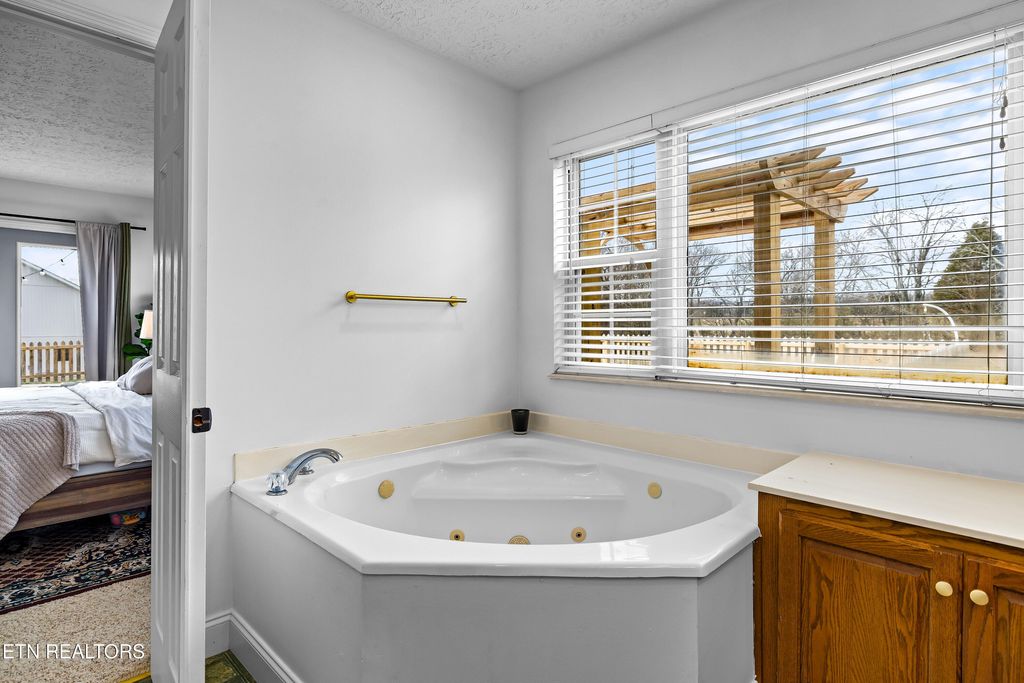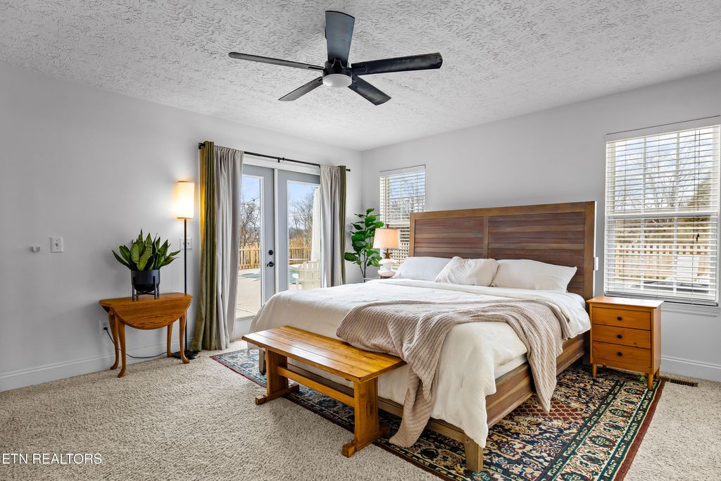 The primary suite is a true retreat with an en-suite bath, Jacuzzi tub, toilet closet, double walk-in closets, and double doors opening directly to the pool area.