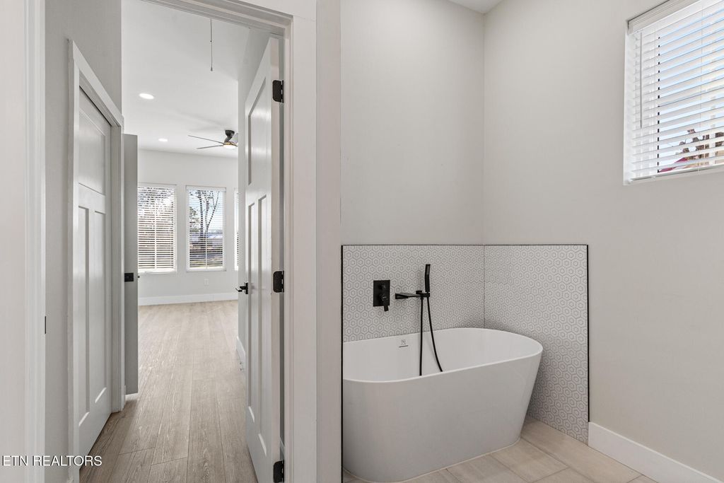 The luxurious bathroom offers a soaker tub, walk-in tiled shower, and elegant finishes for a spa-like experience.