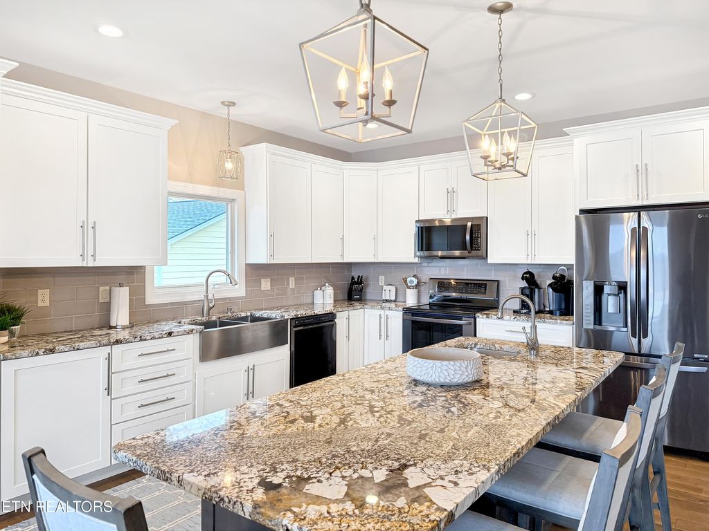 Stunning 2018 lakefront retreat with private dock, luxury finishes, and expansive water views. This 3,992 sq ft home offers 6 sleeping quarters with their own closets and windows(septic permit 3bd), 4 bathrooms, and a 3-car garage, blending quality craftsmanship with exceptional indoor-outdoor living. Hand-selected granite and stonework are featured throughout, adding timeless style. The open-concept main level includes a spacious primary suite with a spa-like bath and double-headed walk-in shower, a great room with gas stone fireplace, and a gourmet kitchen equipped with LG appliances, Kraus sink, and a large island with built-in wet bar"”ideal for entertaining.