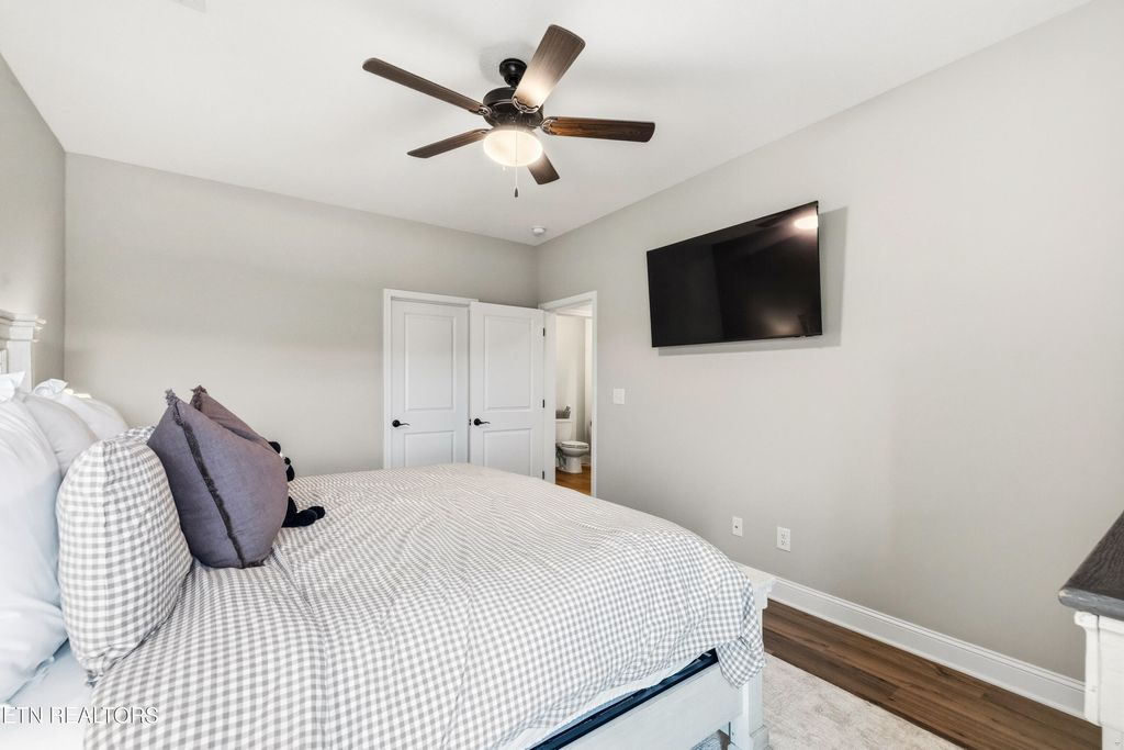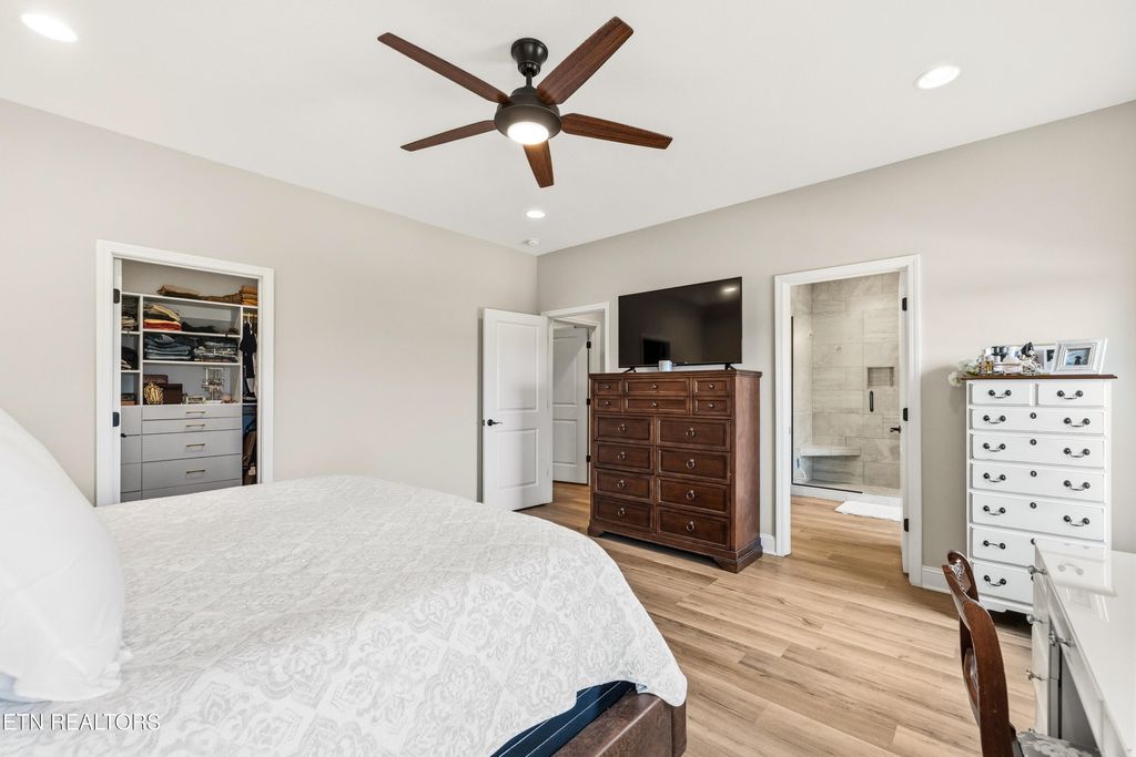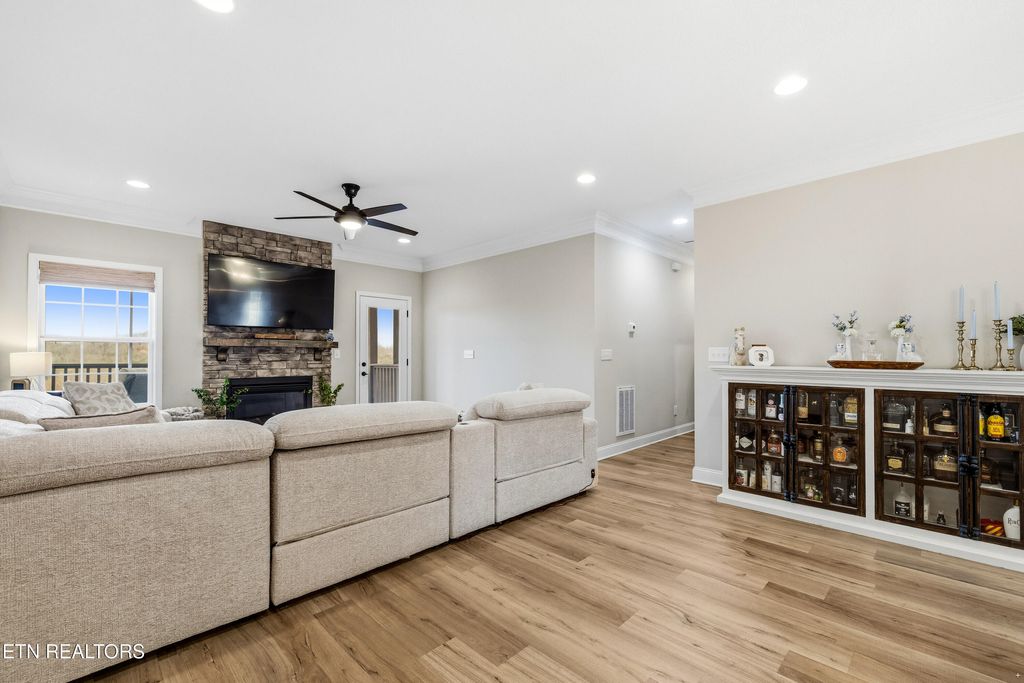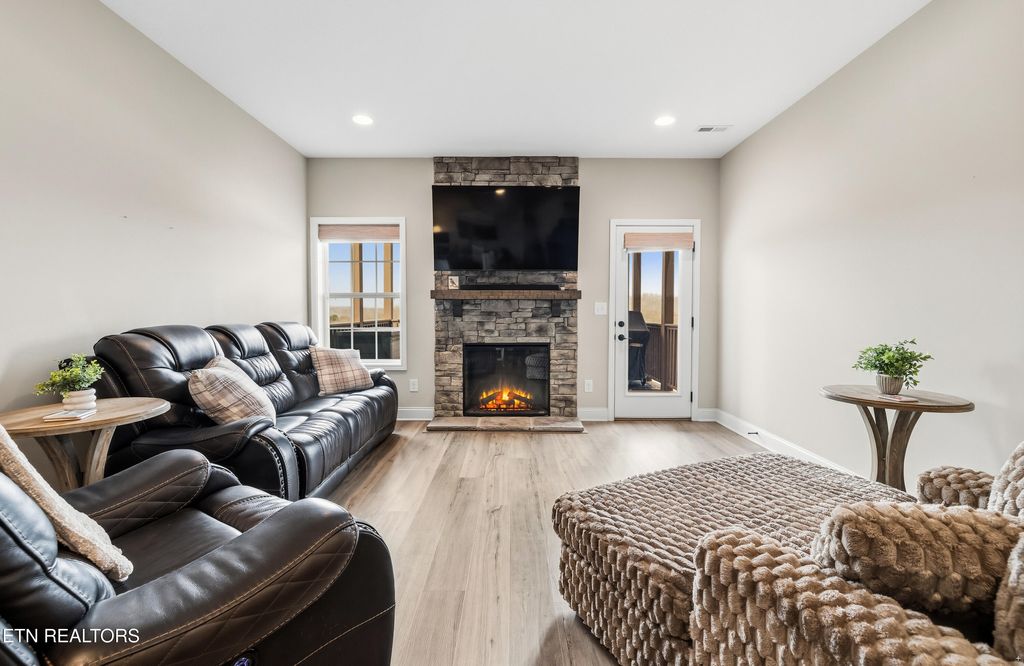 The primary suite on the main level features a newly added custom closet and a spacious en-suite bath, creating a private retreat. The open-concept main living area is perfect for everyday living and entertaining, highlighted by quartz countertops, white shaker-style cabinetry, and LVP flooring throughout. Cozy up by the gas fireplace or step outside to enjoy one of two porches, including a screened-in porch overlooking the course"”ideal for morning coffee or evening relaxation.