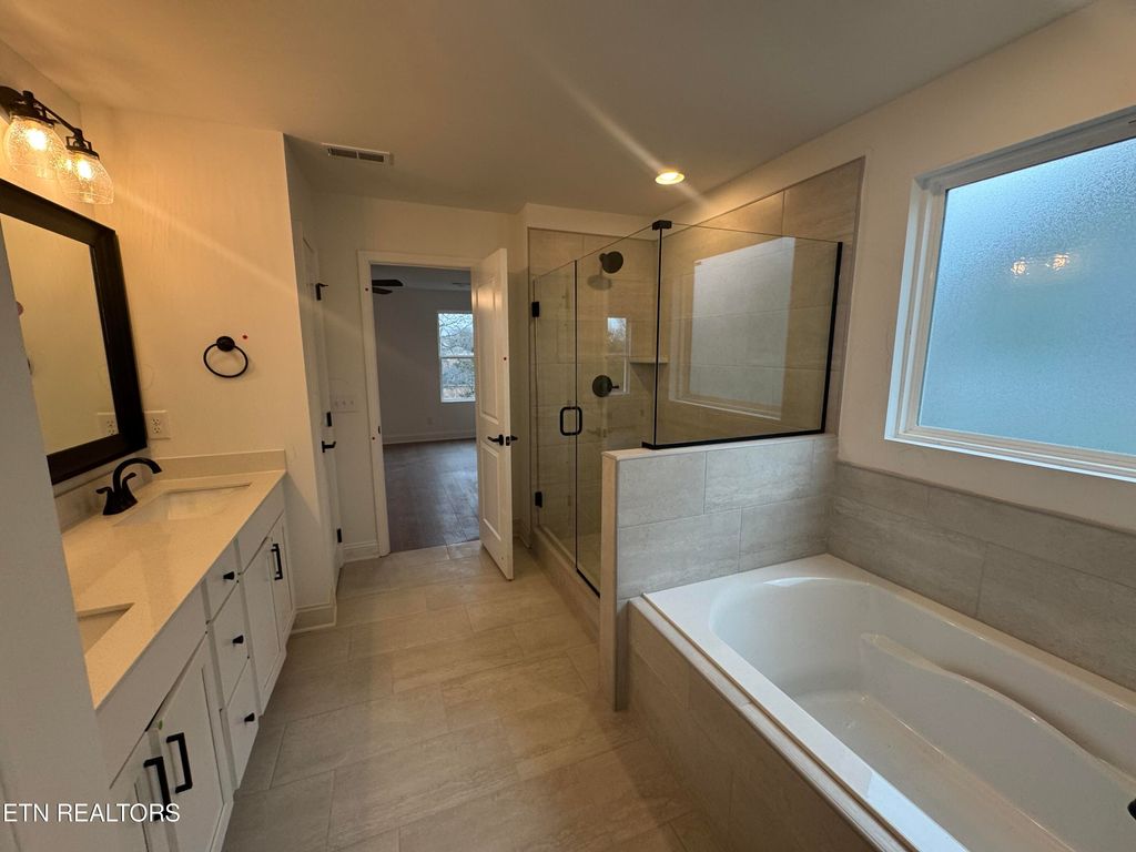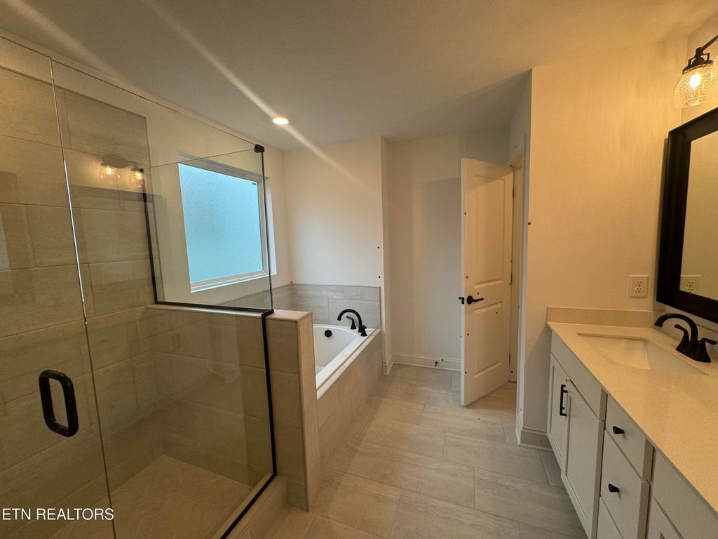 -- Owner's suite located upstairs with a luxurious bath featuring a tiled shower and quartz countertops.