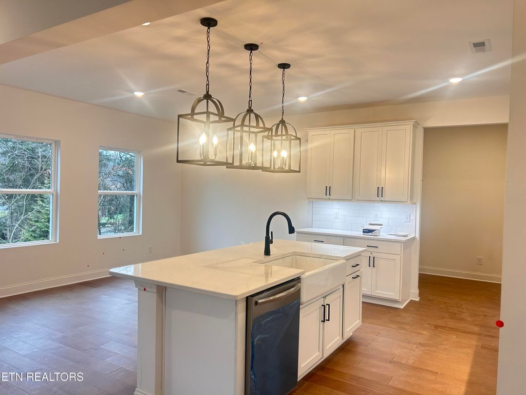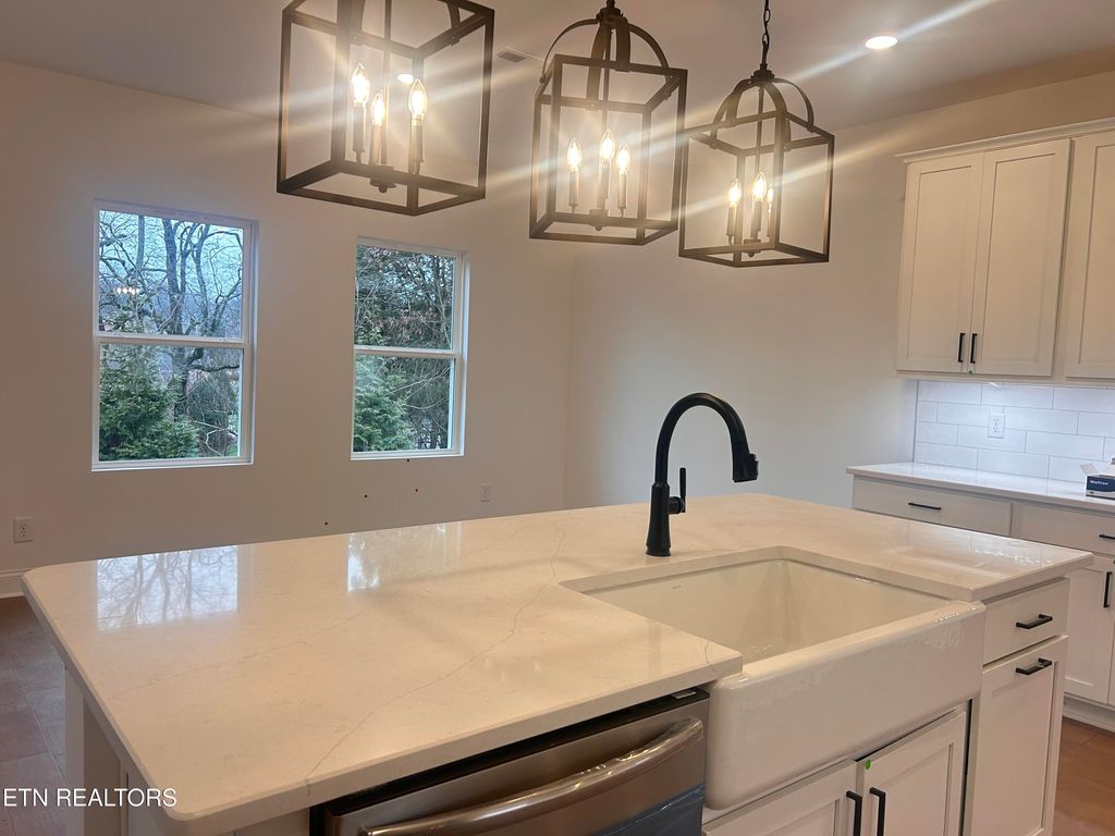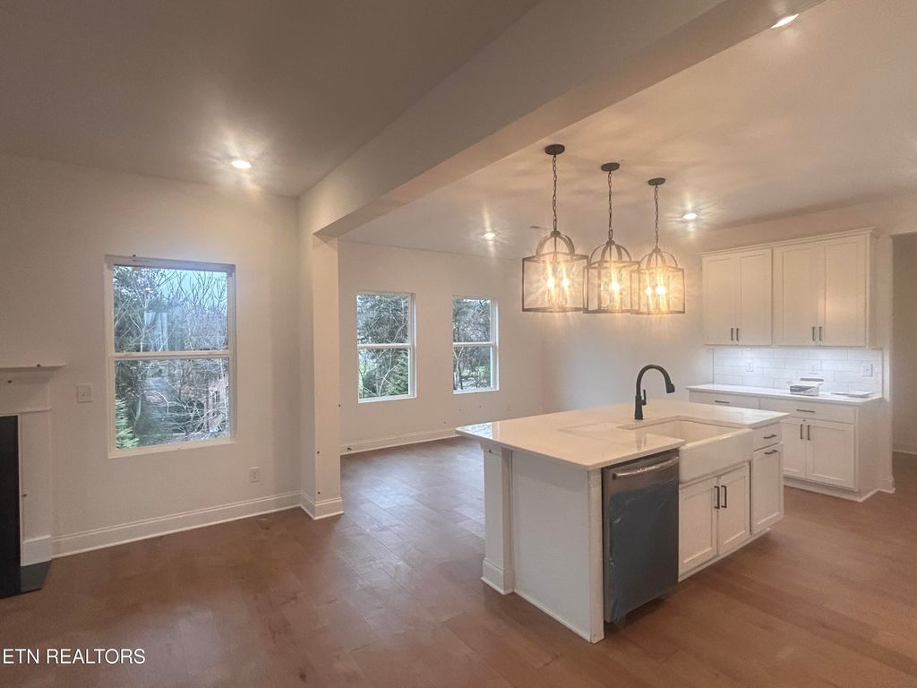 Designed with an open-concept layout, the home features a cozy fireplace and a stunning bistro-style kitchen complete with white cabinetry, designer backsplash, quartz countertops, soft-close drawers, undercabinet lighting, farmhouse sink, and a stainless-steel appliance package"”including a gas stove top, built-in wall oven & microwave, and dishwasher.
