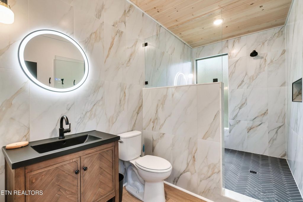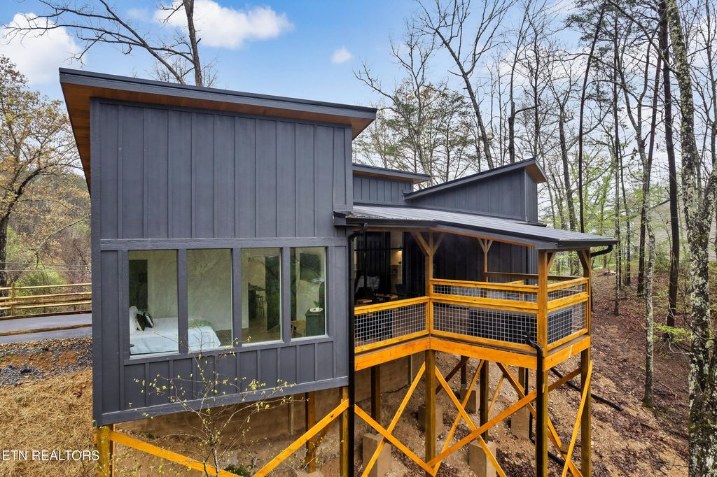 Stunning modern architecture combine with ideal locality & private wooded views, this cabin will dazzle your investment dreams! Wide sweeping views from large store front windows draw the appeal of the Smoky Mountains inside. A private deck for the hot tub sits out and away from the main area and offers a roof covering for added protection from the elements. High vaulted ceilings lead to open space for group gatherings, yet in an intimate setting, surrounded by a glowing fireplace and warmth of the detailed finishing touches of the interior. Granite countertops, stainless appliances, luxury vinyl tile and soft close cabinetry complement the interior kitchen and bathrooms of this 2255 sq ft, 3 bedroom, 2 1/2 bath mountain retreat. Only the finest furnishings and personal touches are evident in the selective accents, accessories and color schemes chosen for this cabin. Completely ready for you or your first rental guest, this cabin will create memories and experiences that will set it apart from all the rest. This cabin is pre-construction-buyer to attain construction loan. Rental projections are available through our developer's rental affiliates. Pictures are from a recently completed cabin-same plan and design.