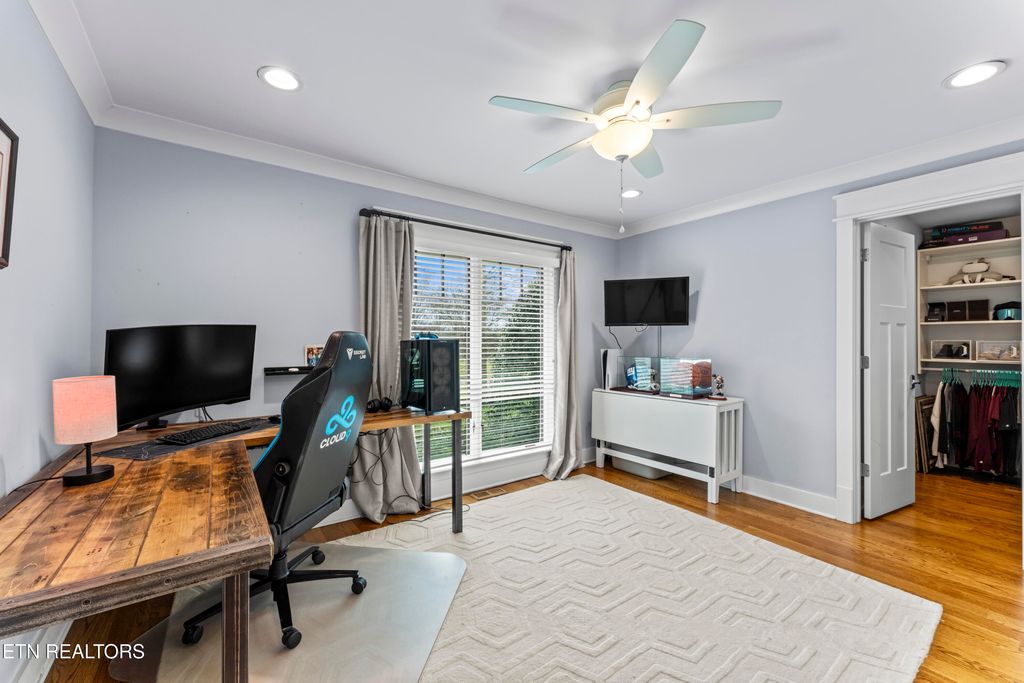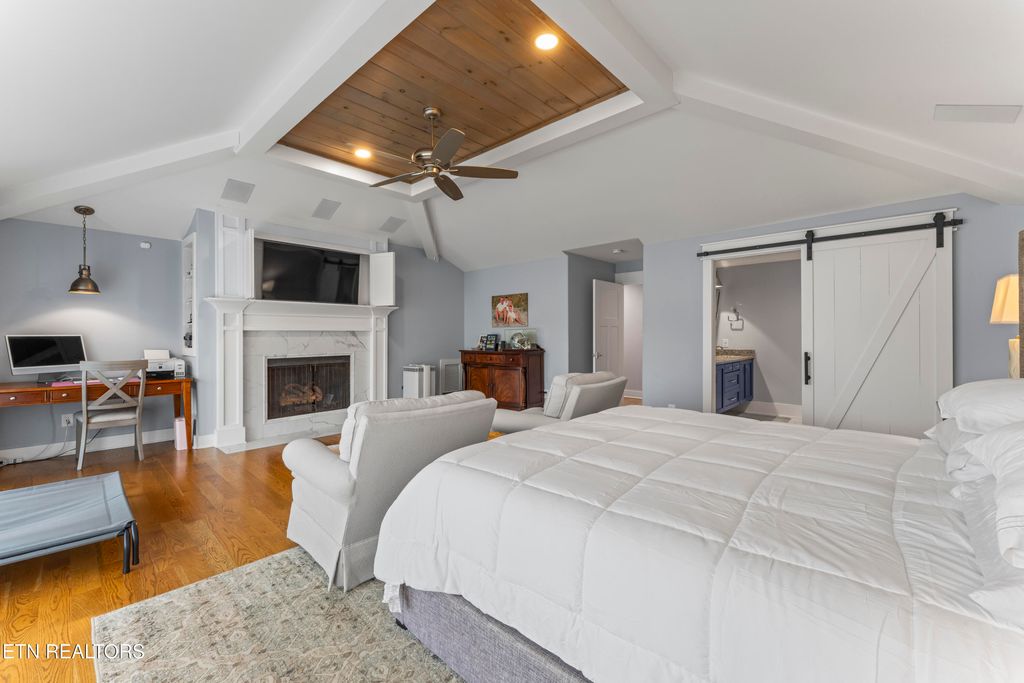 The expansive primary suite boasts a gas fireplace and a custom dressing-room closet with built-in organization. Additional bedrooms offer exceptional flexibility, including one with hall bath access, another with a built-in Murphy bed, and a fourth bedroom or office designed with soundproof glass"”ideal for work or media use.