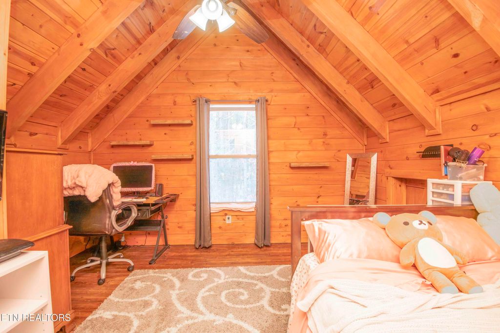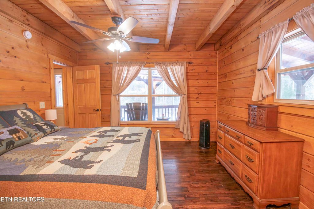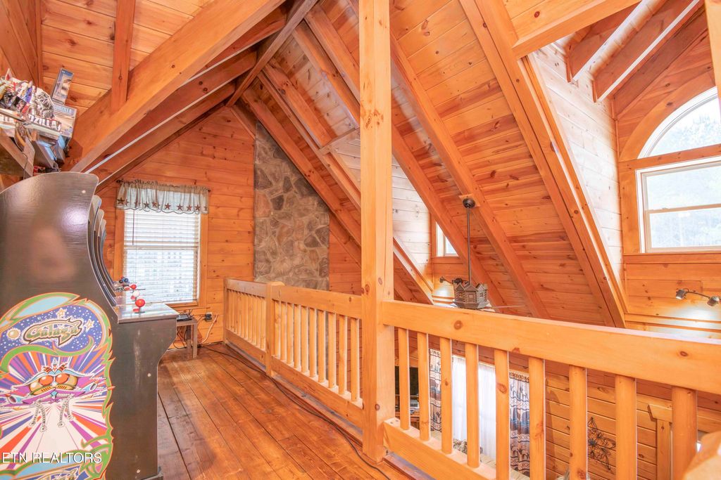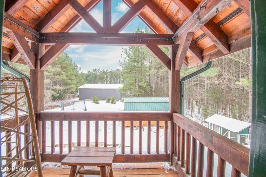 Inside, the primary suite features a jetted hot tub, while the second-floor bedroom opens to a private porch balcony with beautiful views of the surrounding landscape.