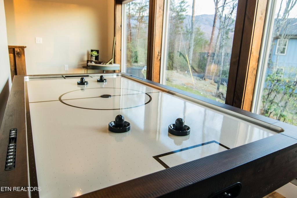 Inside, the open-concept living space is designed for both comfort and connection. A dedicated dining area flows seamlessly into the kitchen and living room, making it easy for guests to gather and visit together. The cozy living area is anchored by a gas fireplace and framed by floor-to-ceiling windows showcasing expansive mountain views, creating a warm, welcoming atmosphere year-round. A gaming nook adds an extra touch of fun and functionality.