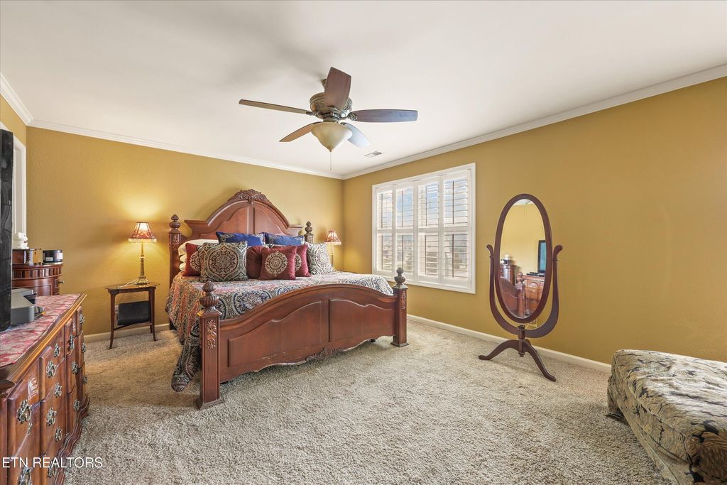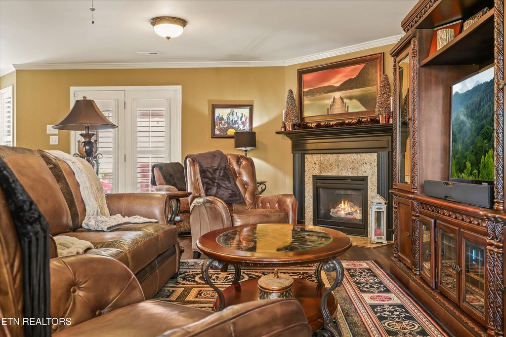 Step inside to a spacious main level featuring brand new luxury vinyl plank flooring installed February 2026. The living room is warm and inviting with a gas fireplace and granite surround, opening seamlessly to the kitchen and breakfast area for easy everyday living and entertaining. A formal dining room with tray ceiling provides the perfect space for gatherings, and crown molding runs throughout the main level. Plantation shutters are installed throughout the entire home, offering timeless style, privacy, and abundant natural light control.