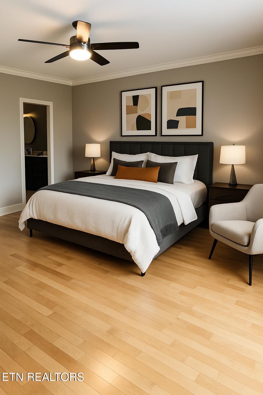 The main level primary suite is a retreat of its own, showcasing a brand new spa inspired bathroom with a soaking tub, tiled shower, new vanity, and updated flooring.