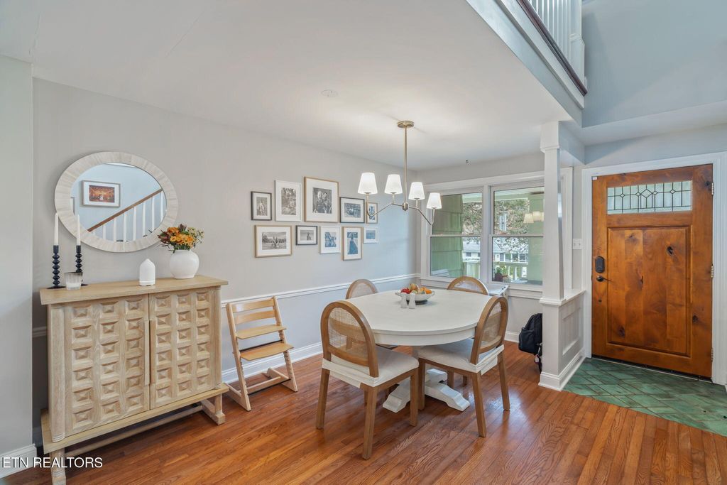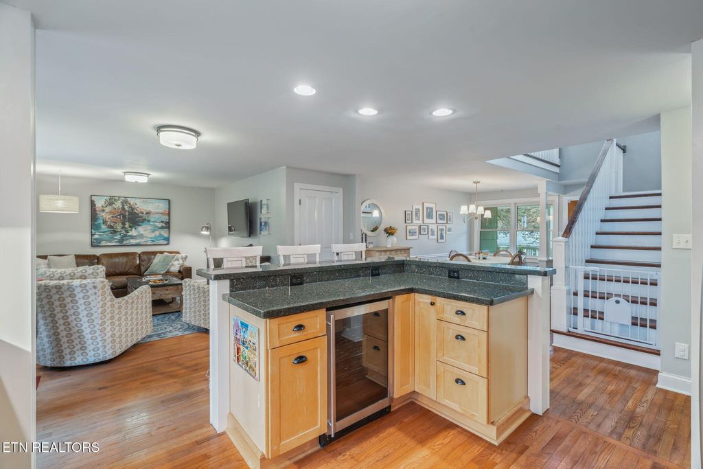 Rich hardwood floors flow throughout the main level and continue up the Craftsman staircase to the 2nd floor, which was added in 2013. The chef's kitchen features granite countertops, an island with seating, stainless steel appliances, and a wine refrigerator.