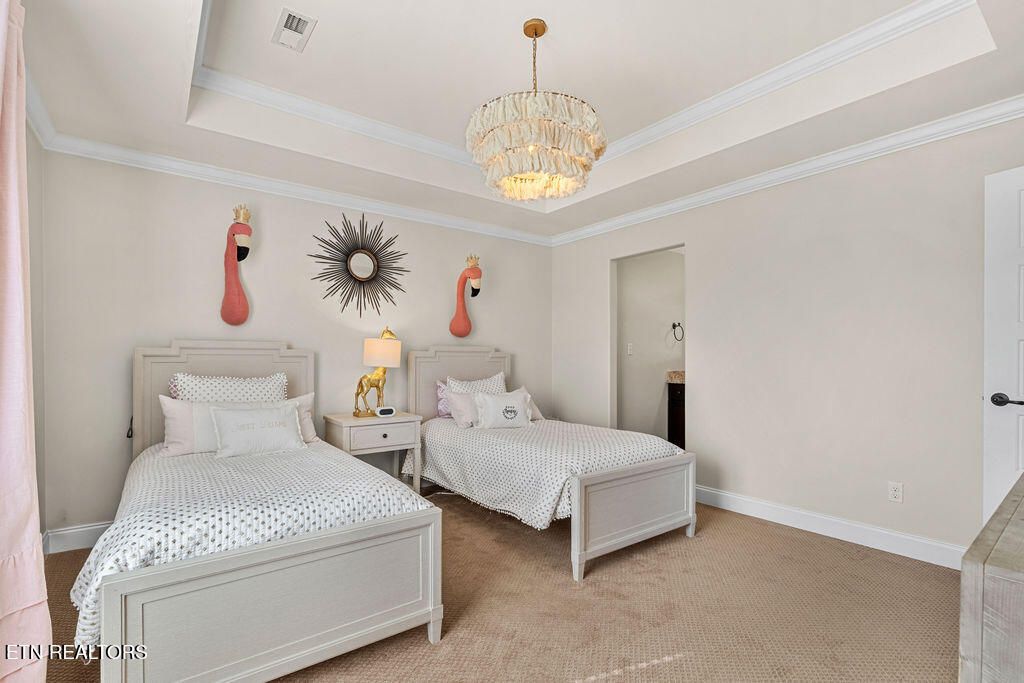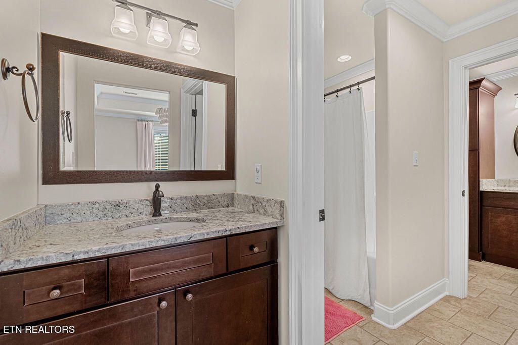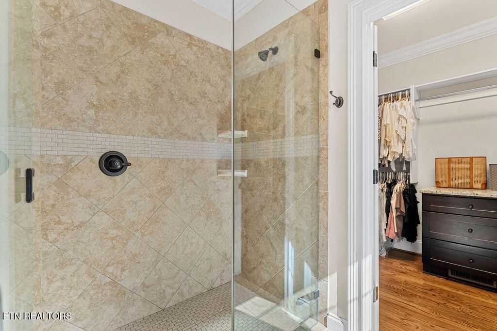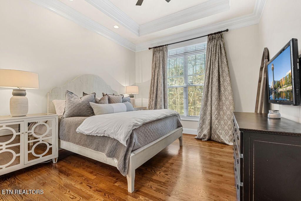 The main-level primary suite offers a peaceful retreat with tray ceilings, hardwood floors, and a spa-inspired bath complete with dual vanities, granite counters, a tiled walk-in shower, and a spacious custom walk-in closet with built-ins.