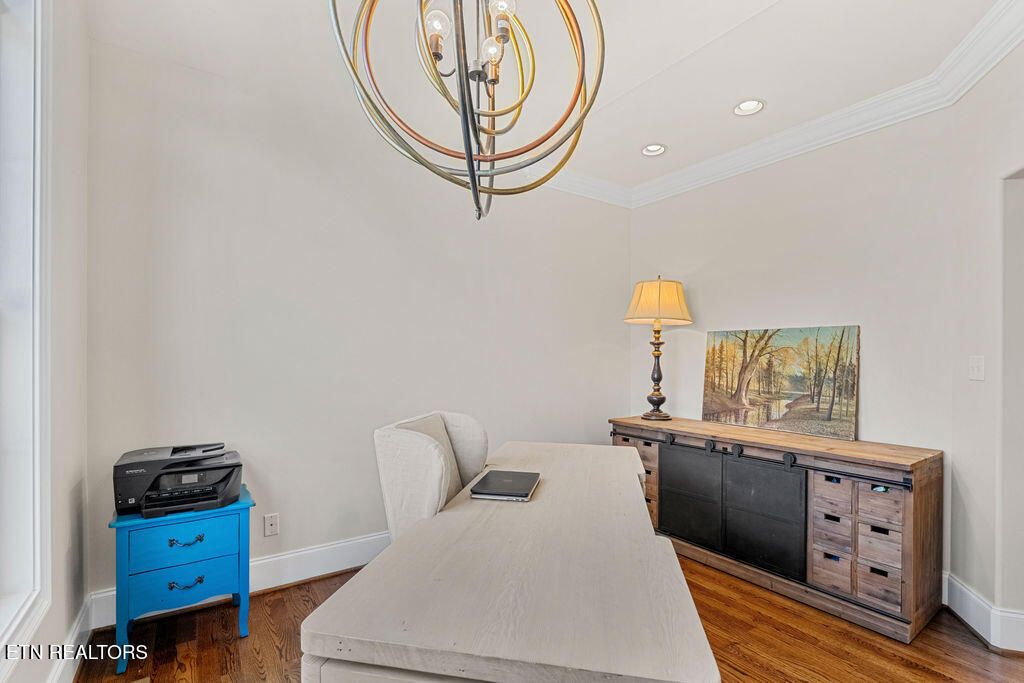 From the moment you enter, rich hardwood floors, detailed crown molding, and soaring ceilings set the tone. A dedicated office just off the foyer provides the perfect work-from-home space with abundant natural light and designer lighting.