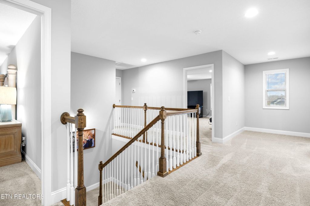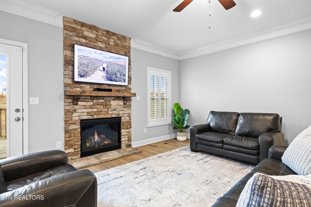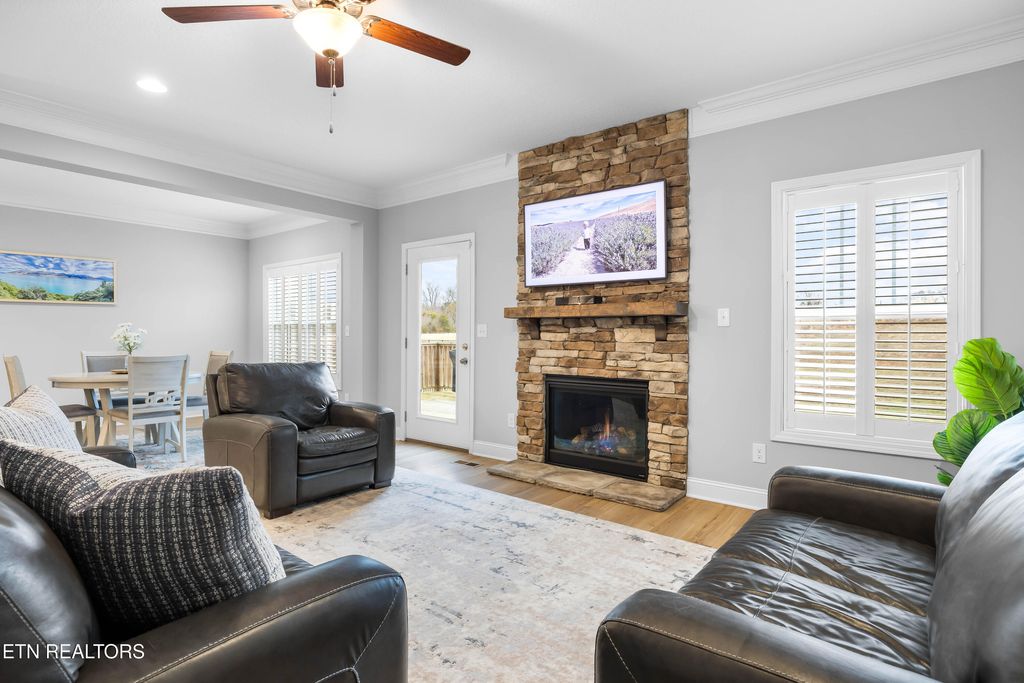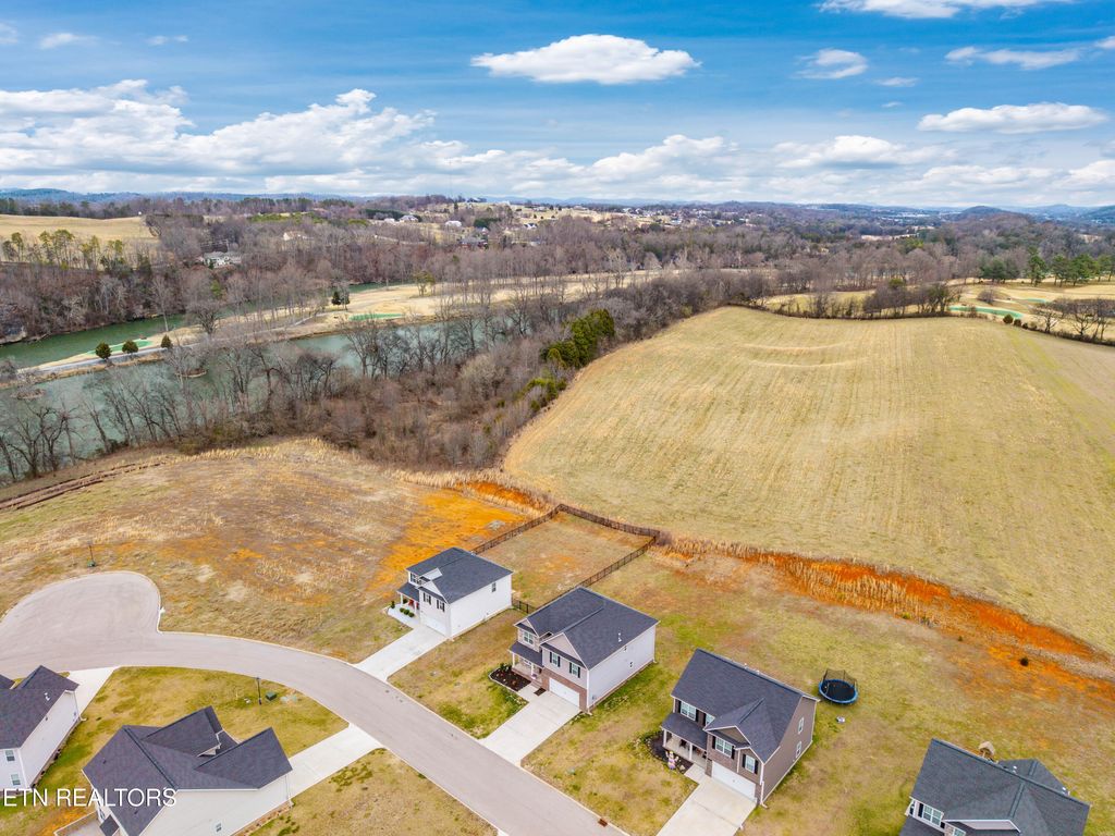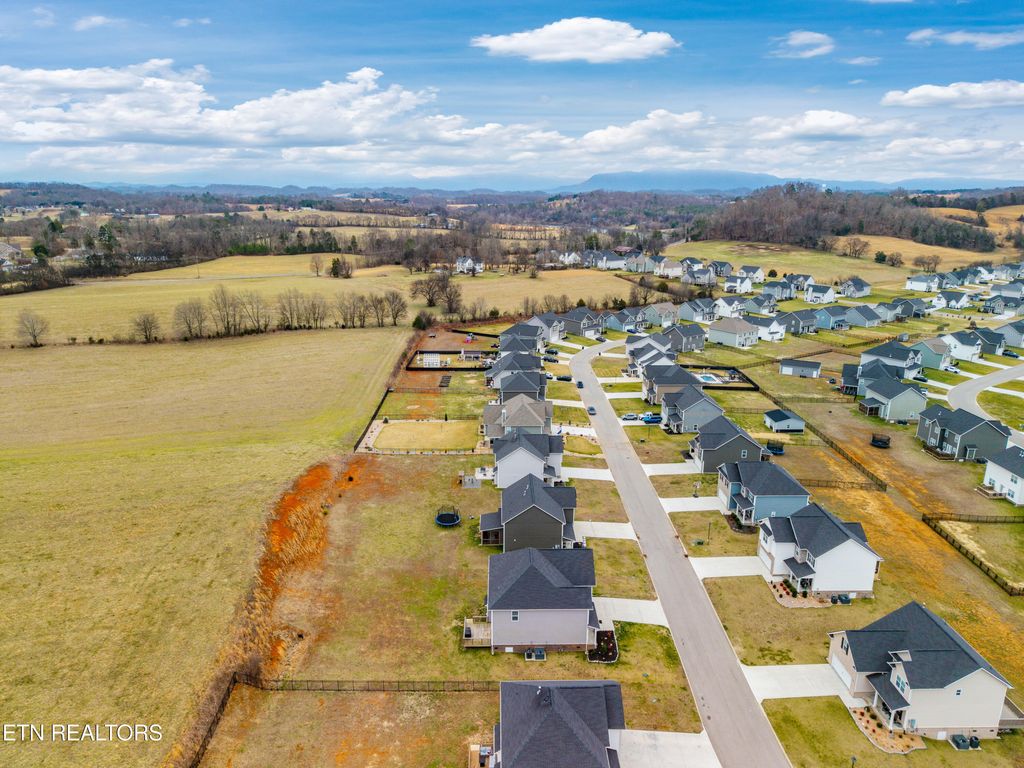 Back downstairs, a charming deck provides the perfect spot for grilling and outdoor entertaining, overlooking a backyard that backs to open farmland for added privacy--no rear neighbors! The two-car garage comfortably accommodates vehicles with extra storage space and includes a Tesla charging station. All of this is set in a neighborhood tucked into a bend of the French Broad River, complete with a community pavilion and boat launch! Don't miss this opportunity to own a beautiful home with rare backyard privacy in a convenient Sevierville location! Samsung Frame TV in living room, Samsung Bespoke AI Family Hub refrigerator in kitchen, and Tesla charger in garage all convey with the home. Select furniture pieces, Tesla, and VW Atlas are also available for purchase separately.