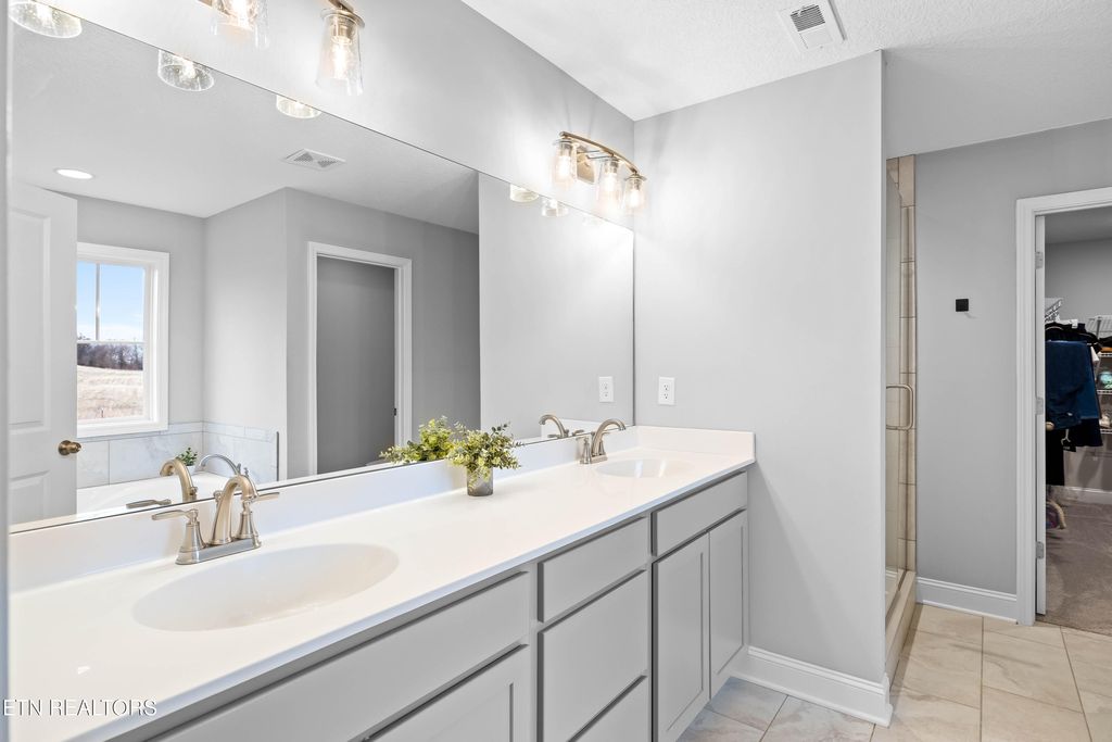 Upstairs, a well-planned layout offers the primary suite, two additional bedrooms, a hall bath with double vanities, a conveniently located laundry room, and a spacious bonus room with storage closet. The primary suite anchors the upper level, showcasing plantation shutters and a spa-inspired bath with a soaking Jacuzzi tub overlooking tranquil farmland views, complemented by tile flooring and a tiled walk-in shower with a frameless glass door.