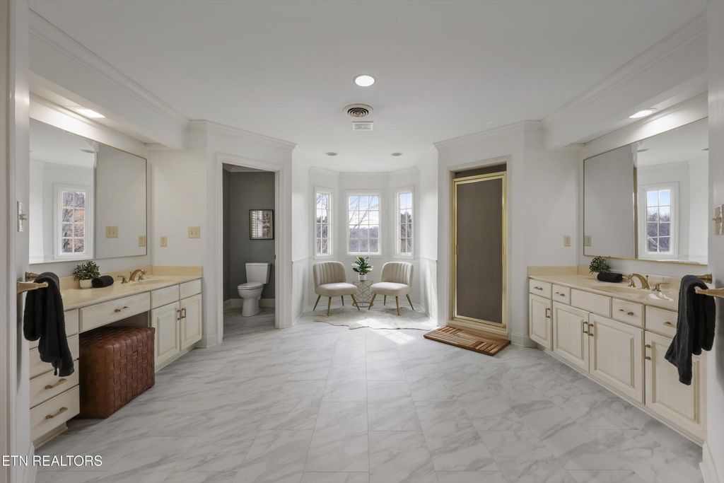 The spacious master suite boasts tray ceilings, fireplace, sitting area, and dual walk-in closets. Each bedroom features its own private bath.