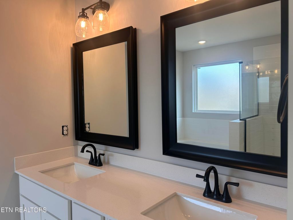 -- Owner's suite located upstairs with a luxurious bath featuring a tiled shower and quartz countertops.