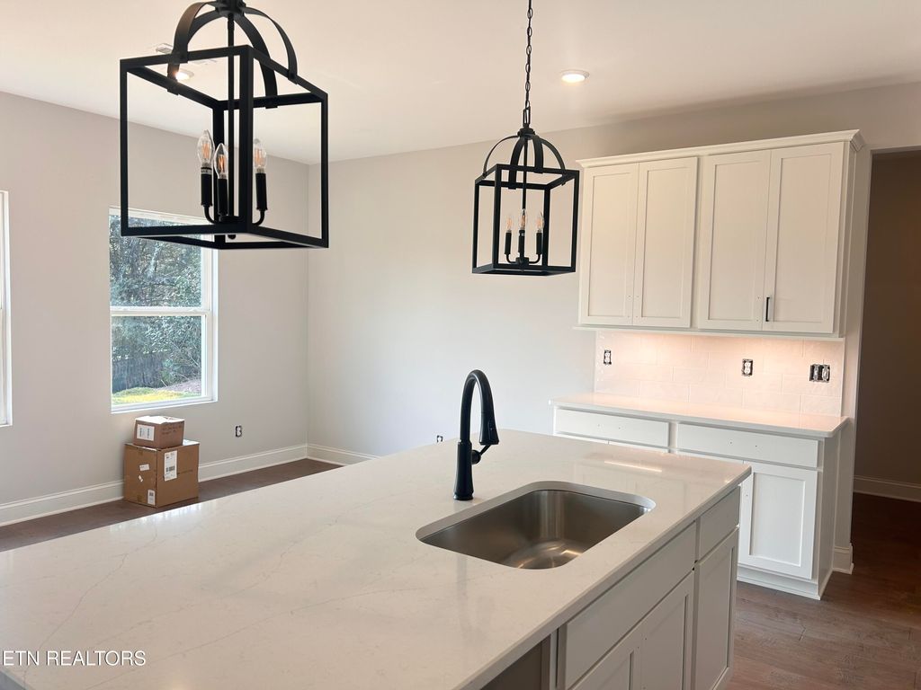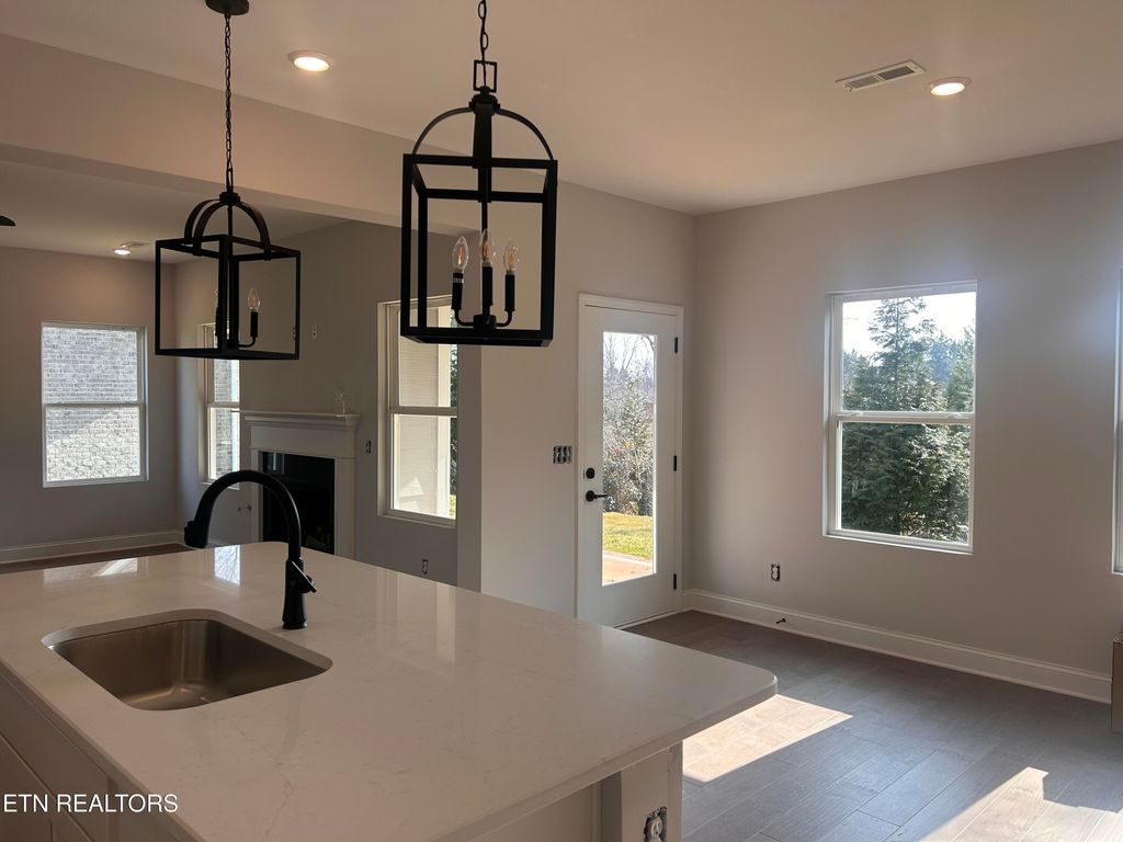 Designed with an open-concept layout, the home features a cozy fireplace and a stunning bistro-style kitchen complete with painted white cabinetry, designer backsplash, quartz countertops, soft-close drawers, undercabinet lighting, farmhouse sink, and a stainless steel appliance package--including a gas stove top, built-in wall oven & microwave, and dishwasher.