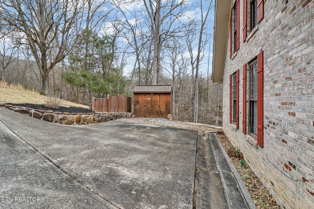 The oversized covered carport with overhead storage, a circular driveway, extra concrete parking areas, and an extra storage shed offers plenty of outdoor space for guest parking and boat storage.