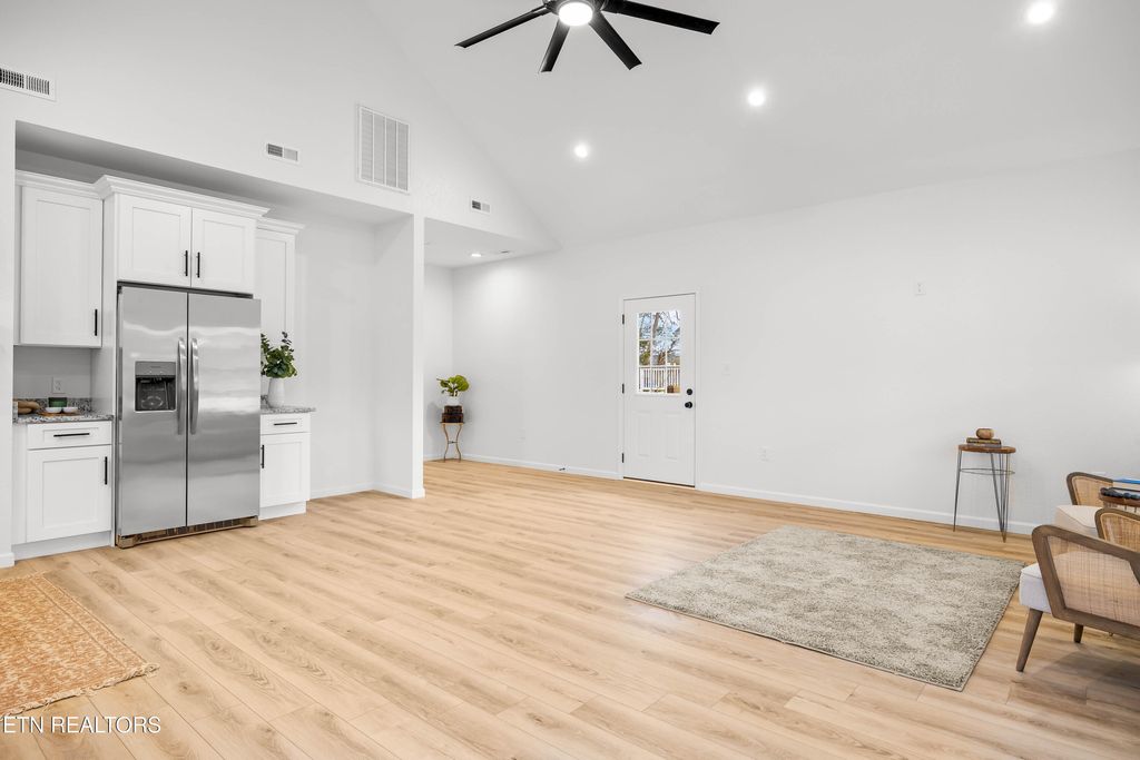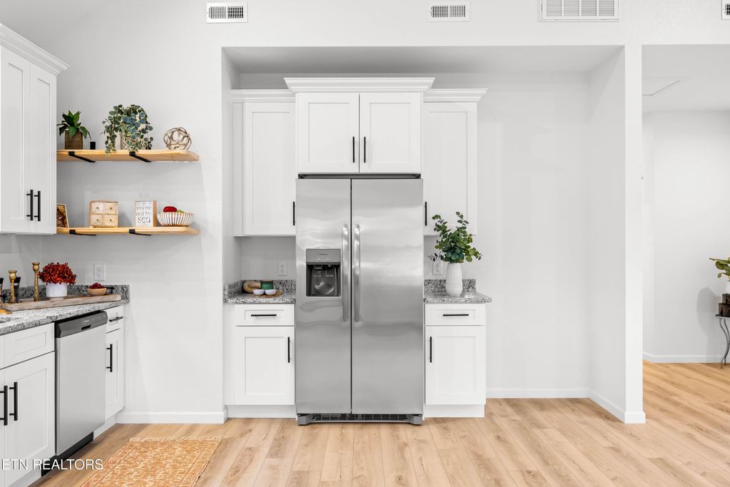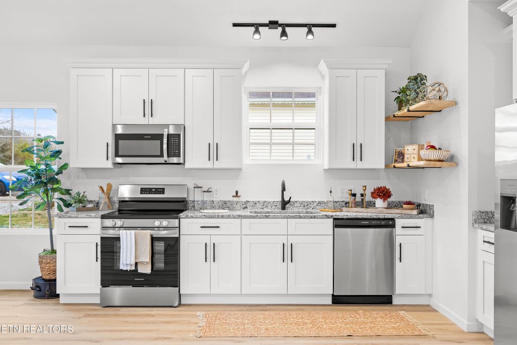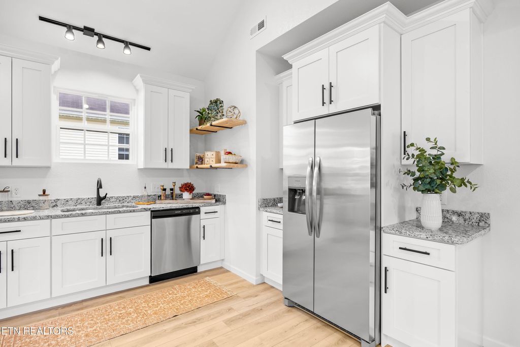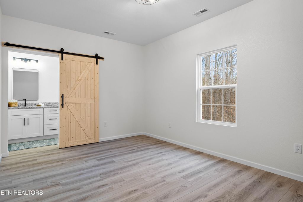 The open-concept floorplan seamlessly connects the living room and kitchen, creating a bright and inviting space ideal for everyday living or hosting guests. The kitchen features elegant granite countertops, white 42-inch cabinetry, and a full suite of stainless steel appliances, including the refrigerator. Granite surfaces continue into both bathrooms, providing a cohesive, upscale finish throughout the home. The primary suite includes a stylish sliding barn door, adding character and charm.