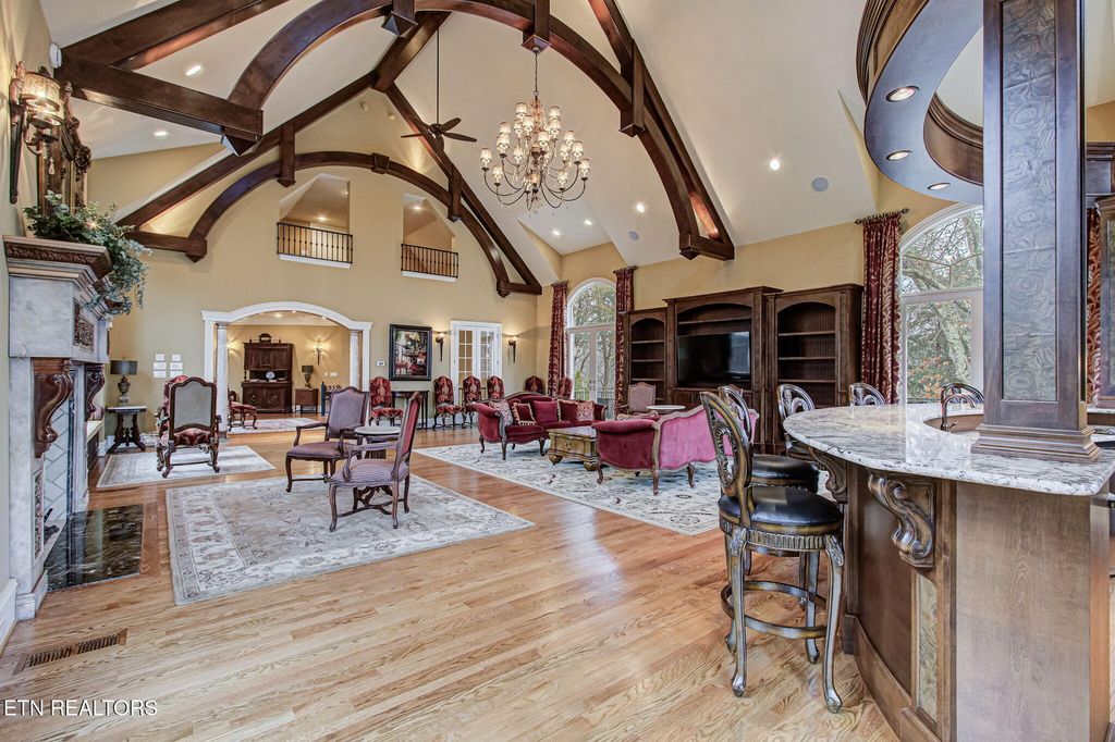 The heart of the home is a staggering 40'x30' Great Room, a masterclass in design featuring soaring 25' timber-beamed ceilings, a massive marble fireplace, and a grand bar crafted for the connoisseur. The culinary wing--anchored by a Chef's kitchen and a cozy keeping room--serves as a rustic yet refined gathering space. Walls of glass create an effortless transition to an expansive outdoor patio and a screened porch, both with private fireplaces and views of the lush grounds and Sounds of Waterfalls with no neighbors in sight.