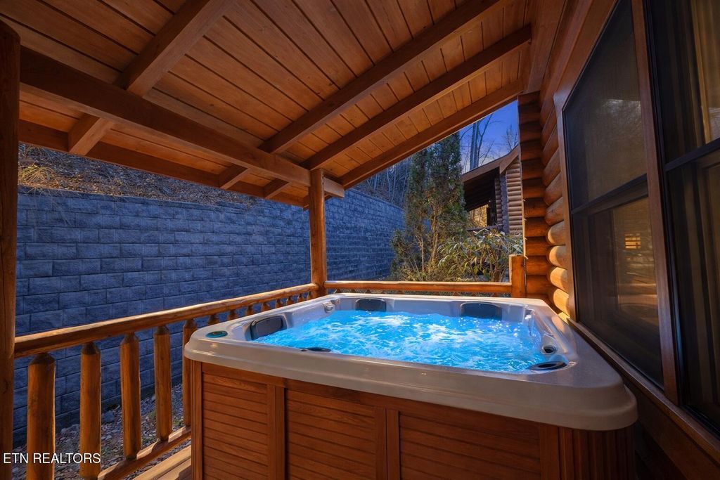 Outdoor living is equally impressive with two covered decks designed to fully embrace the Smoky Mountain setting. Guests can begin the day with coffee in the rocking chairs, unwind in the private hot tub after exploring the National Park, and gather in the evening around the glow of the fireplace for a true mountain getaway experience.