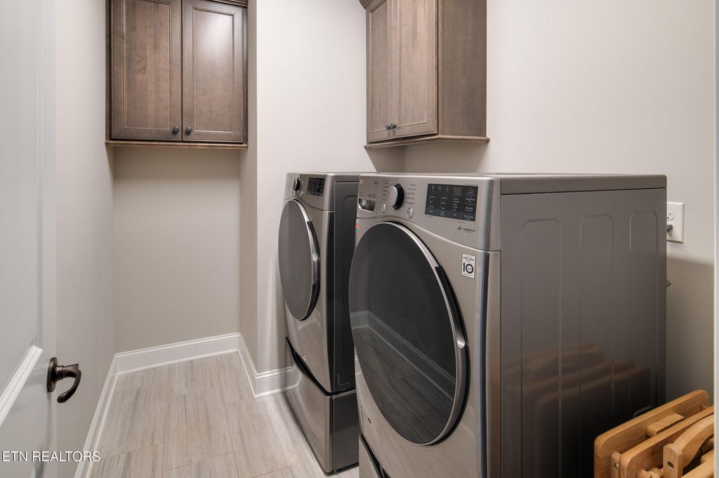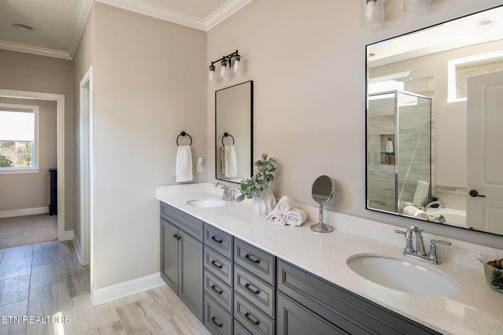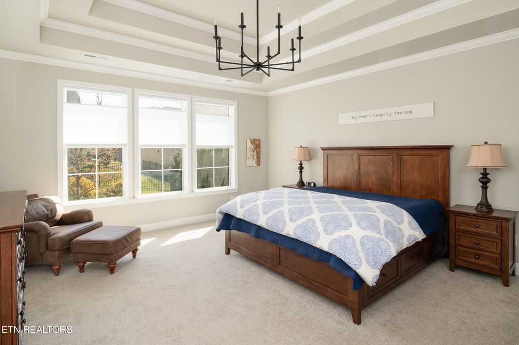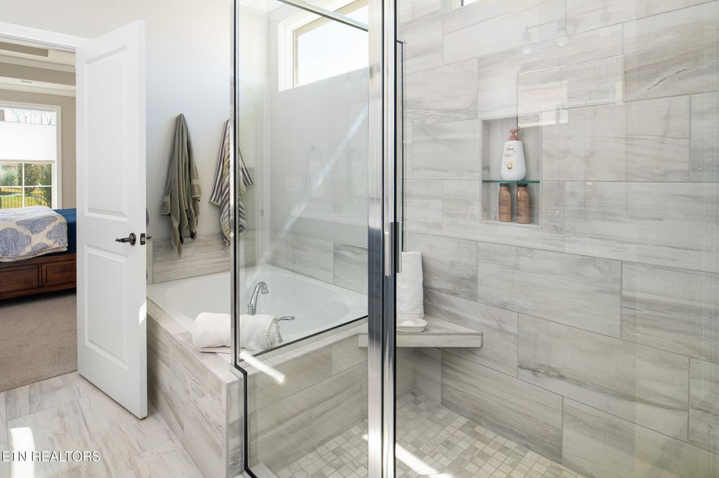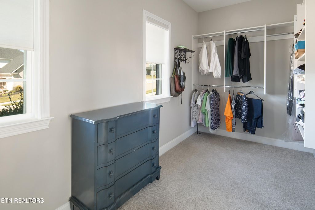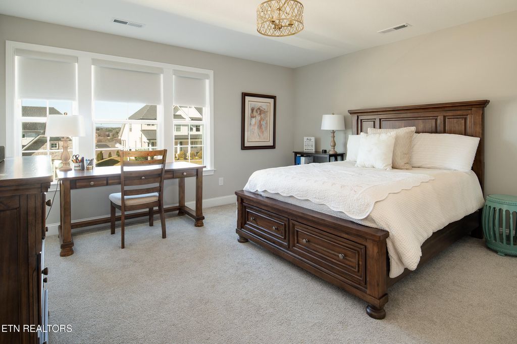 The oversized primary suite is conveniently located on the main level and filled with natural light from multiple windows. The luxurious en-suite bath offers a walk-in shower, relaxing soaking tub, dual granite vanities, and a generous walk-in closet.
