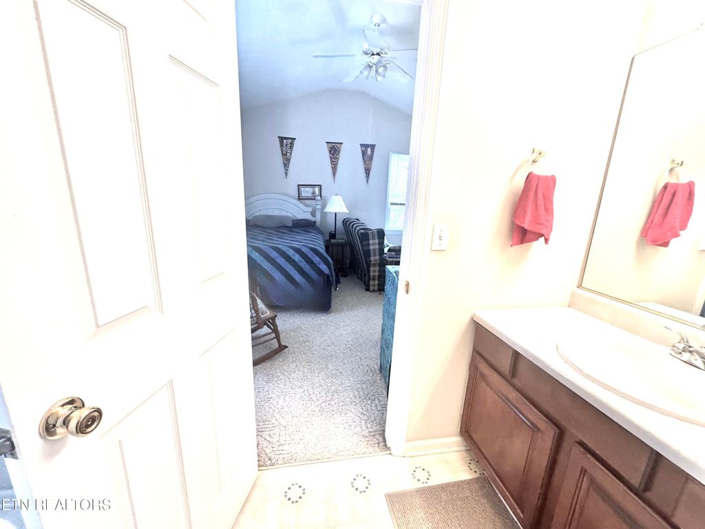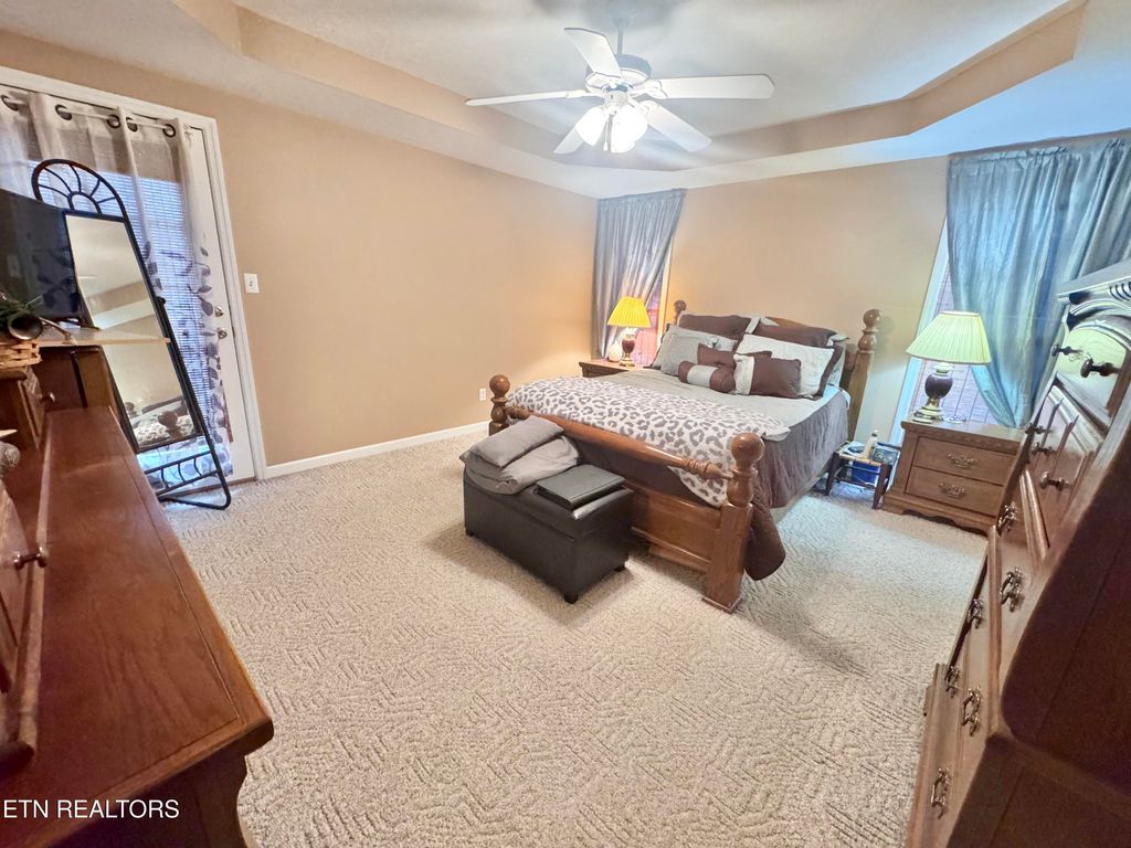 The spacious master suite includes a relaxing Jacuzzi tub, walk-in shower, two closets, and a ceiling fan for added comfort.