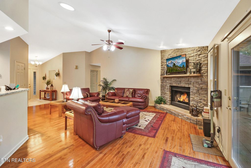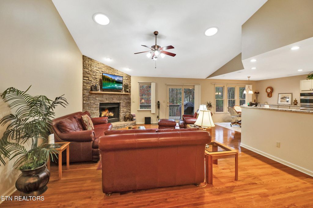 This spacious home features a 3-car garage with RV option, providing ample room for vehicles, storage, or recreational equipment. Inside, you'll love the open-concept living area with rich hardwood floors, abundant natural light, and a stunning gas stone fireplace that serves as the focal point of the main living space.