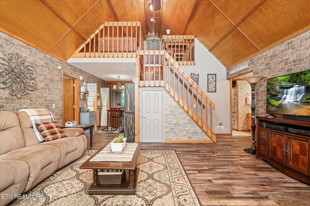 This immaculately maintained cabin-style home offers the perfect blend of charm, comfort, and peace of mind with a new roof and HVAC within the last 10 years and all new flooring throughout the main living space and huge primary suite. Step inside to a gorgeous living room with vaulted ceilings, creating a warm, open atmosphere perfect for relaxing or entertaining.