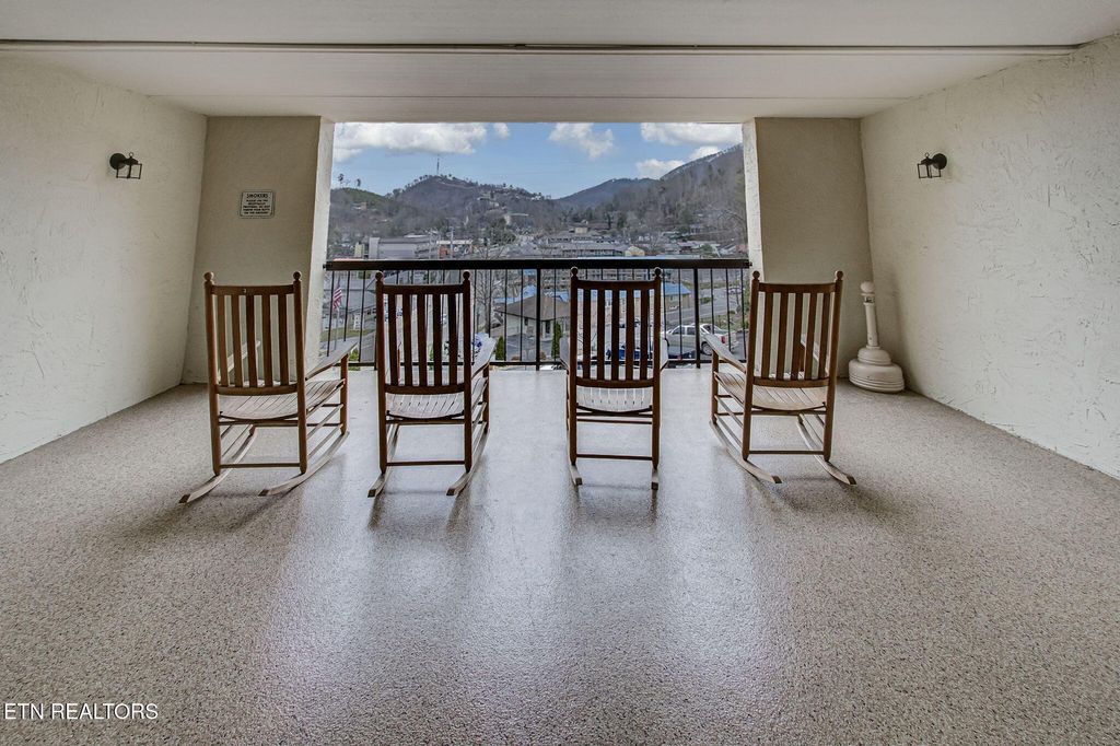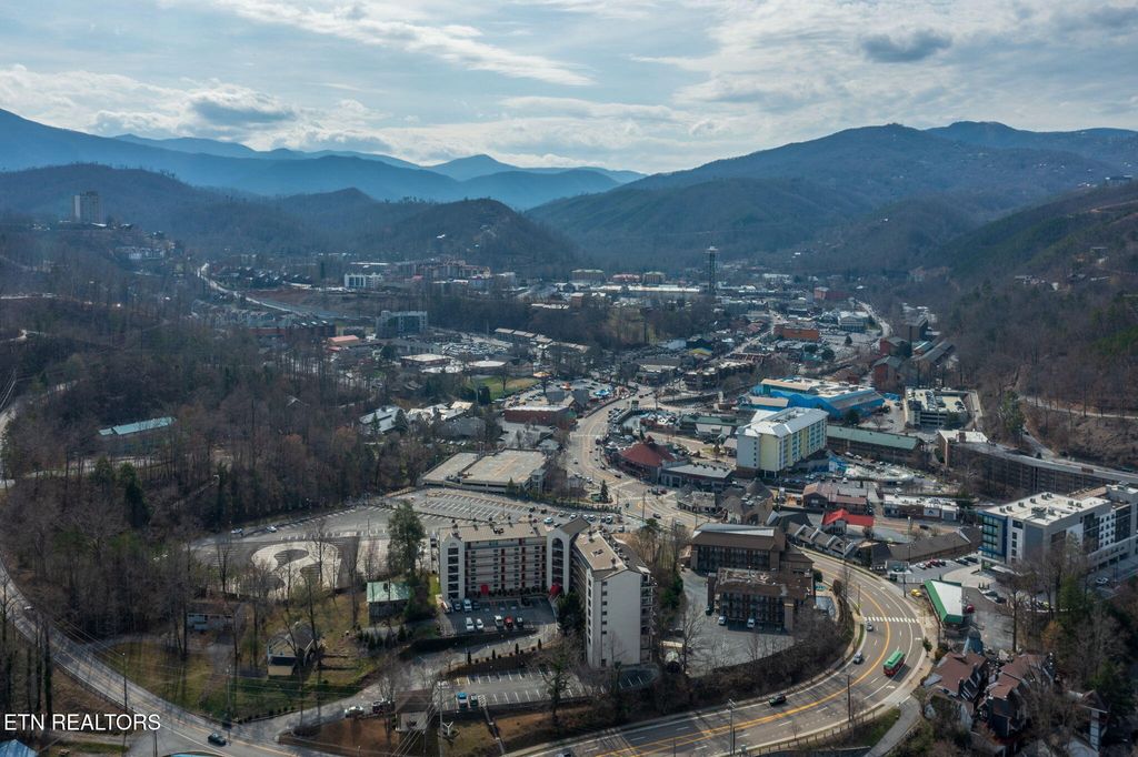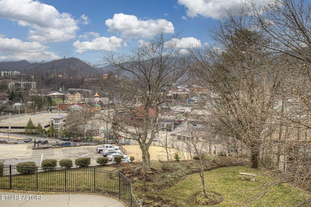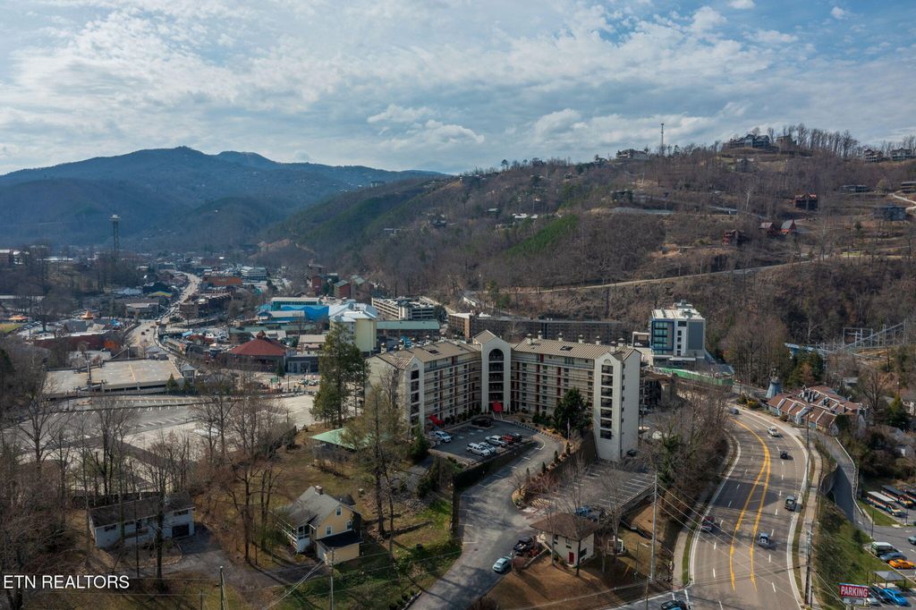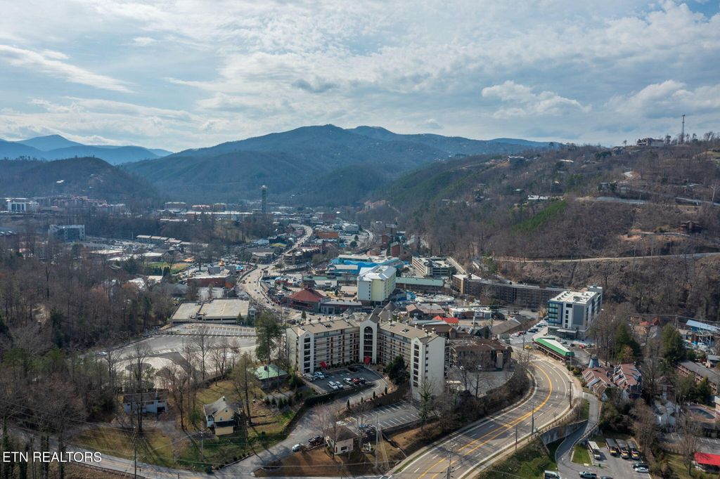 Discover a charming 2-bedroom, 2-bath contemporary condo just a short stroll from downtown Gatlinburg. Nearly 800 sq ft, the open great room centers on a warm masonry fireplace and flows to a dining area and well-equipped kitchen -- ideal for relaxing evenings or hosting guests. Both bedrooms offer private bathrooms and closets for maximum comfort and privacy. Step outside to your secluded rear covered balcony overlooking the community pool, hot tub, and views of downtown and the mountain range! This professionally managed complex includes a community swimming pool, adding rental and leisure appeal. With an unbeatable location, you're minutes from the scenic Great Smoky Mountains National Park and nearby recreation like Ober Gatlinburg, plus the shops, dining and wonderful attractions of downtown. Perfect as a primary residence, second home, or turn-key short-term rental -- this condo blends comfort, convenience, and strong income potential.