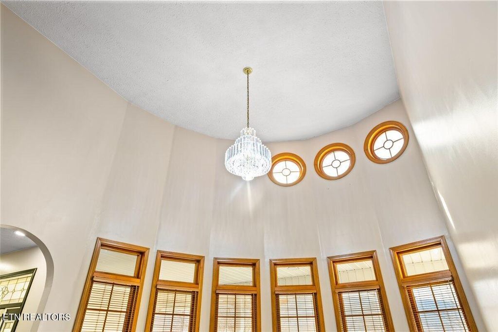 This home offers 4 bedrooms, 2 full bathrooms, two fireplaces, and a split-bedroom floor plan. Architectural details welcome you as you enter, including an arched opening leading to the guest suite and dining area. The dining room features ceilings 16 feet high and a surround of windows, filling the space with natural light and showcasing the mountain views.